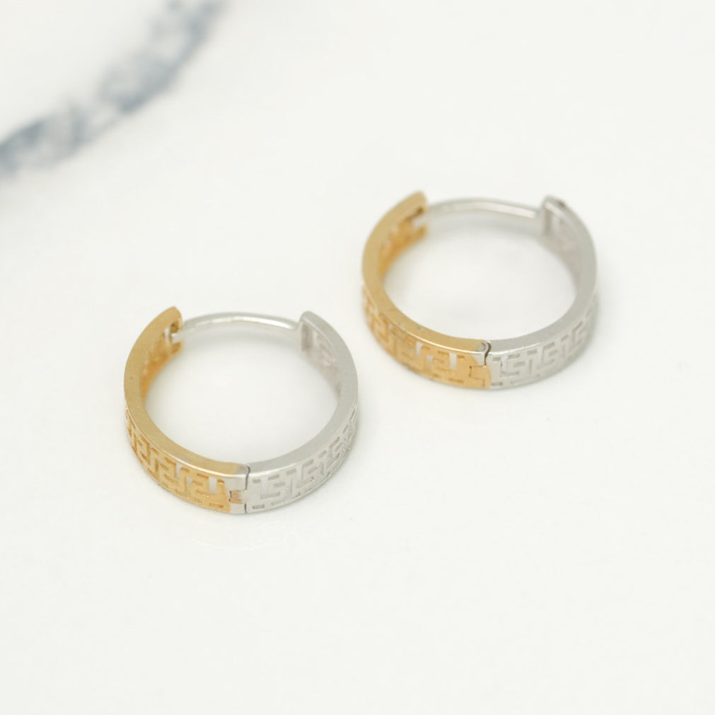 Huggies - Two-tone yellow & white 10K gold Greek key design - BOG049