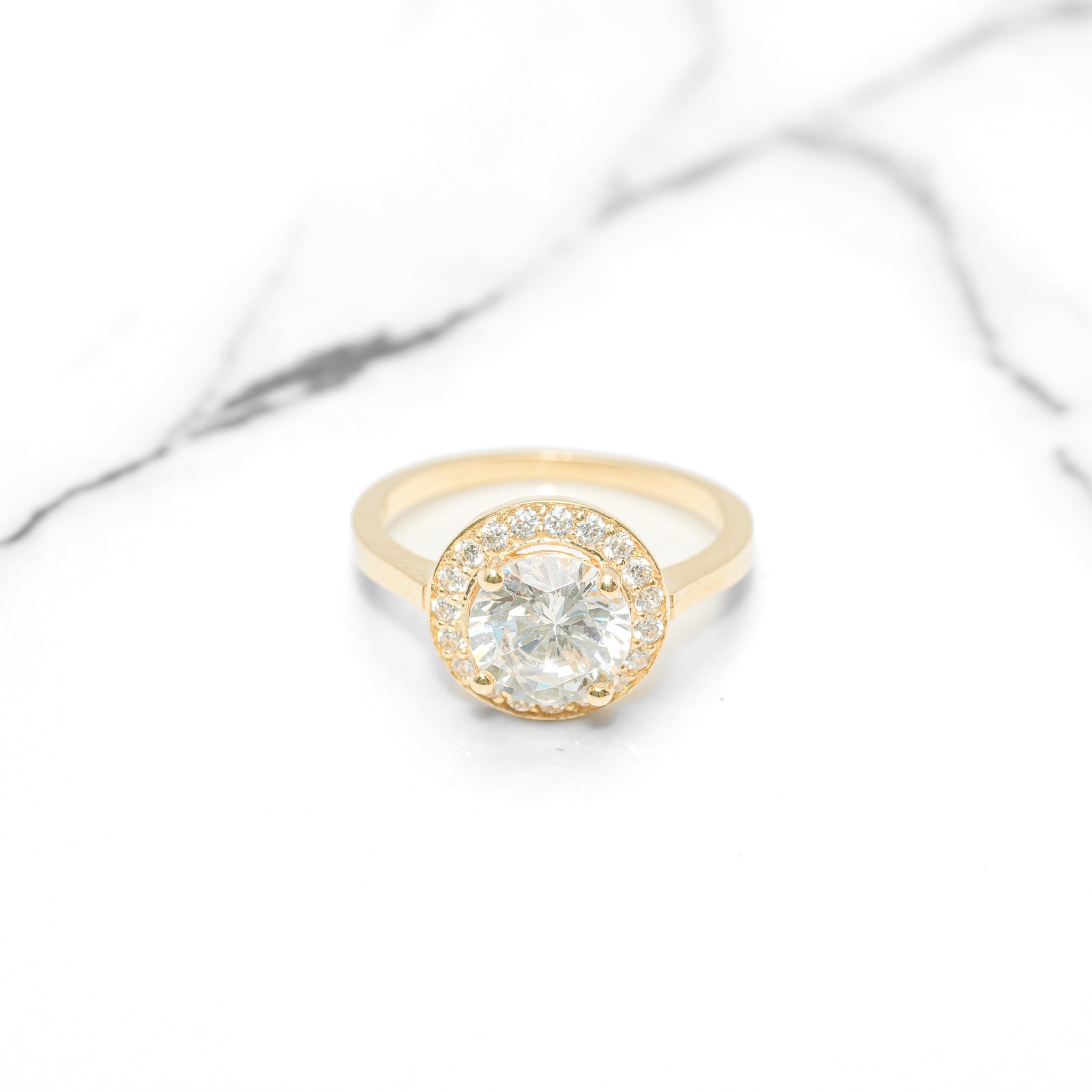 Cette bague en or 10K jaune est ornée d'une pierre cz taille brillant, entourée d'une monture halo pour un look glamour et raffiné.