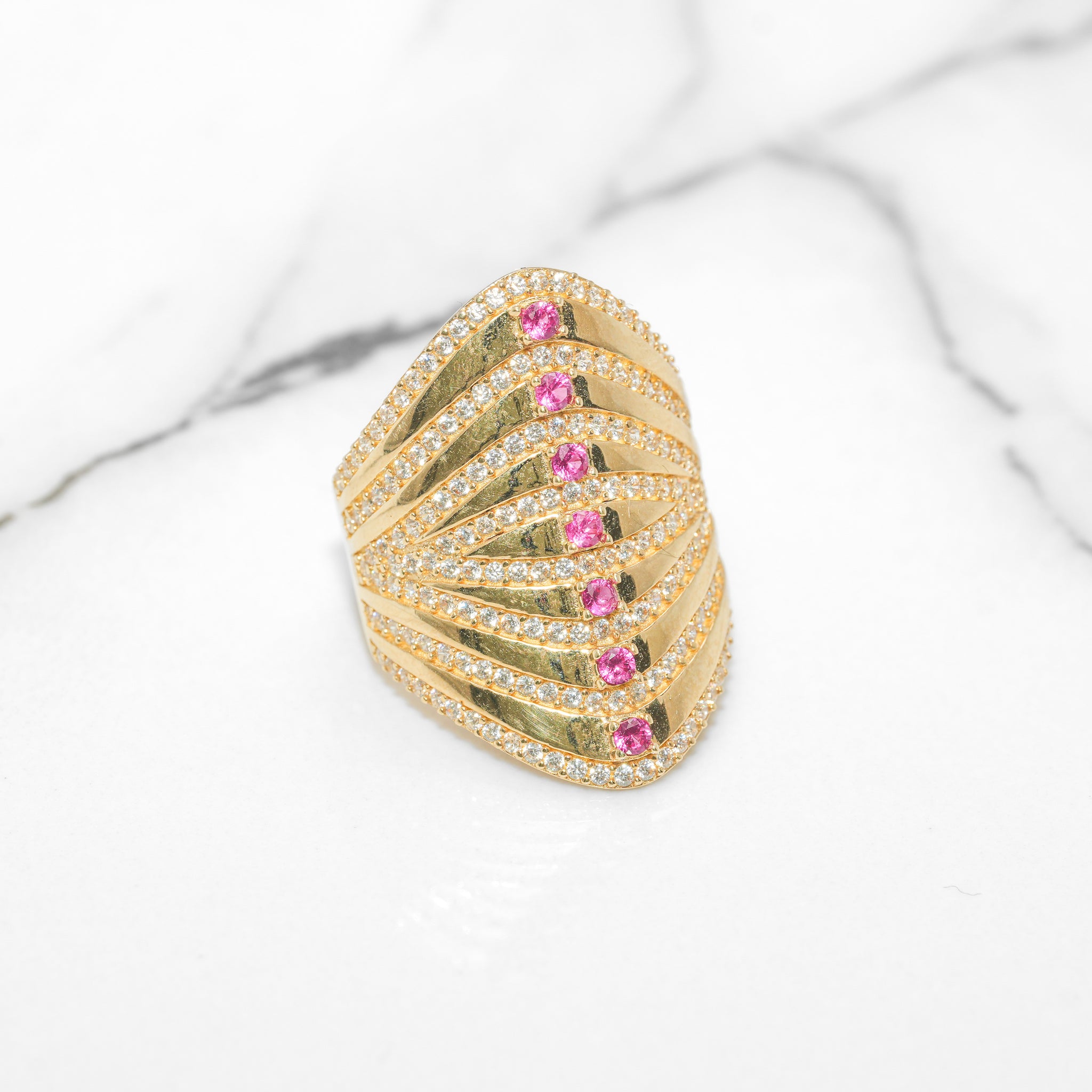 Cette bague en or 10K jaune est une pièce audacieuse avec ses pierres cz et ses pierres rose, parfait pour ajouter une touche vibrante à votre look.