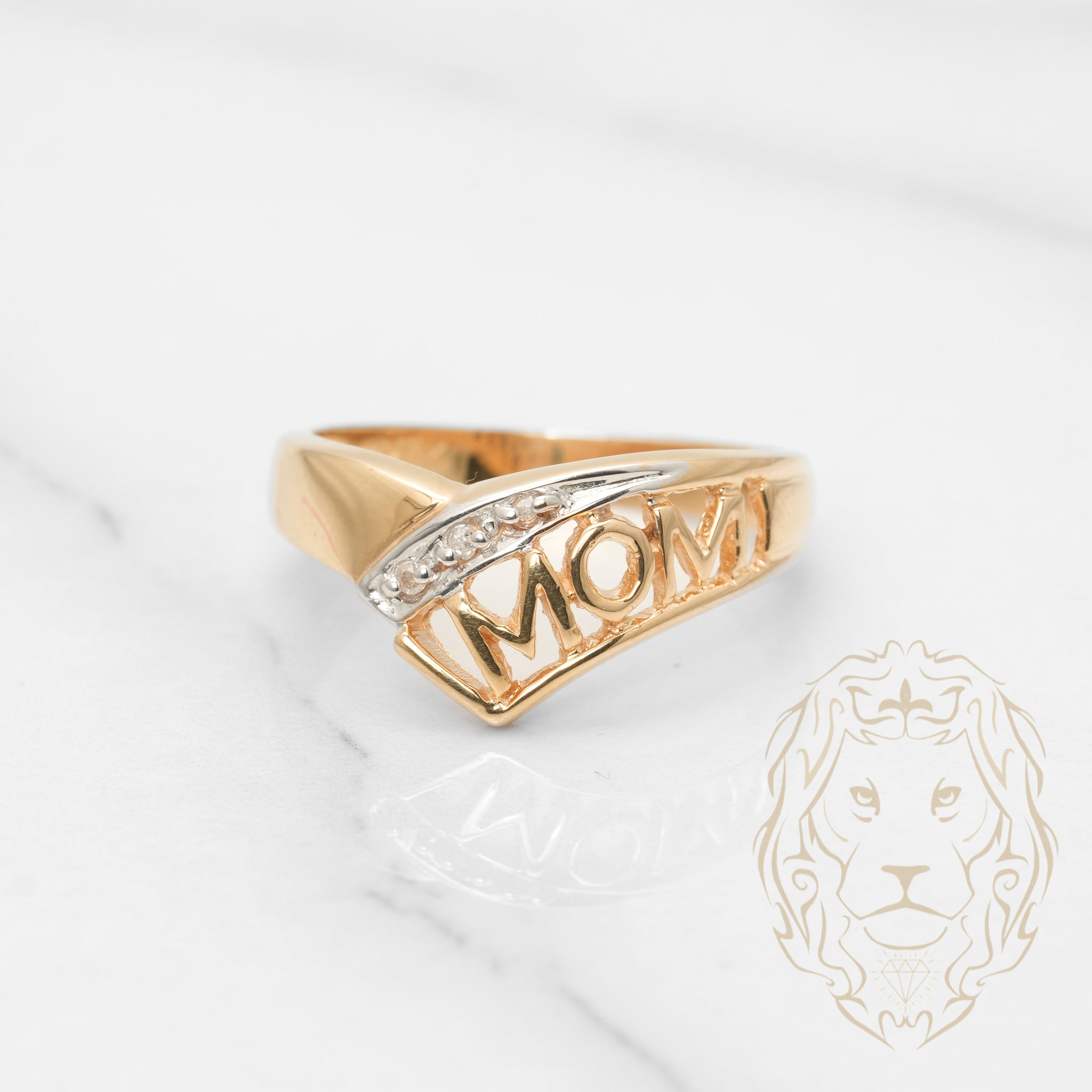 Cette bague en or deux tons 14K, ornée du mot "MOM" et rehaussée de 0.03 carat de diamants naturels, est un bijou symbolique pour exprimer votre amour.