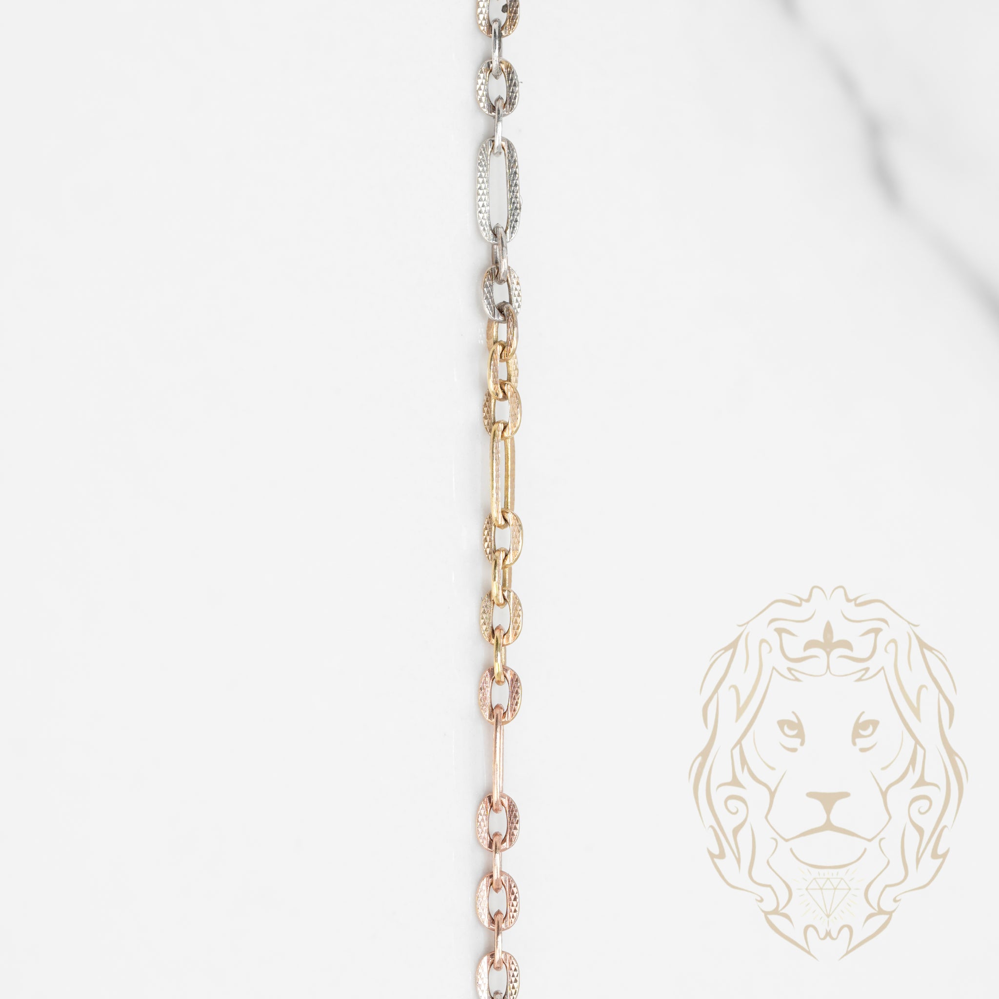 Cette chaîne tricolore en or 10K de 2 mm fusionne les maillons figaro et câble, le tout avec une finition florentine unique. Une pièce élégante et pleine de caractère.