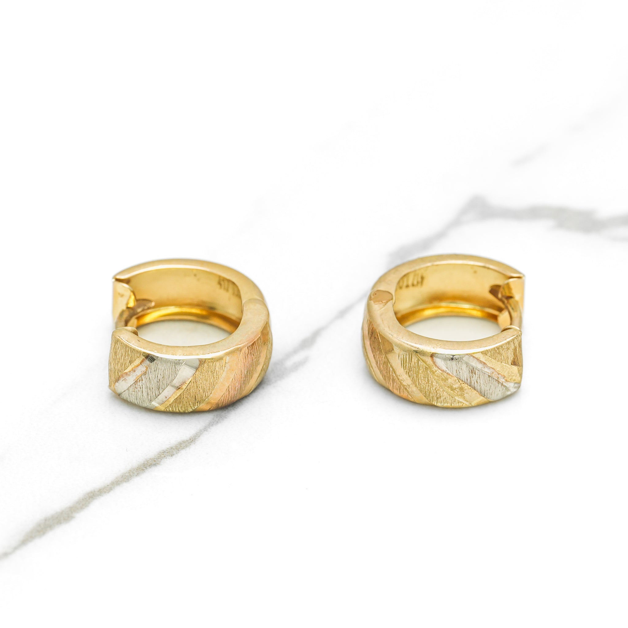 Ces huggies en or 10K tricolore, avec des rayures diagonales brossées en jaune, blanc et rose, ajoutent une touche de sophistication et de modernité à votre style. Parfaits pour un look élégant et distinctif.