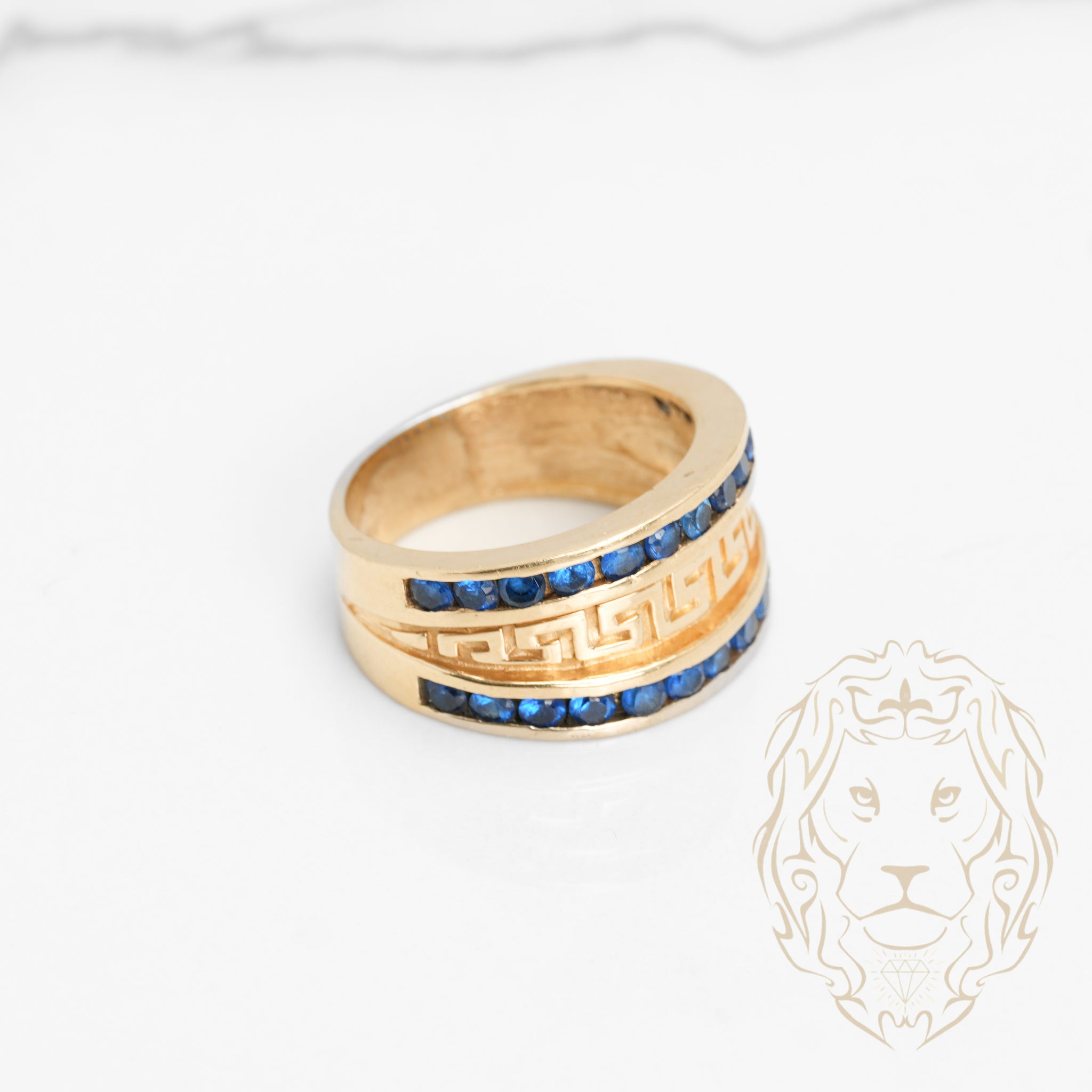 Bague - Or 10K jaune motif clé grecque & pierres cz bleues serties en canal - RIG772