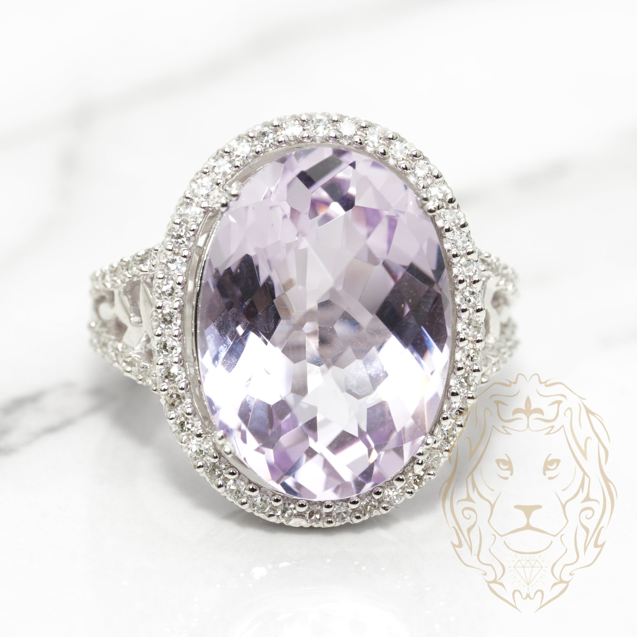 Avec une améthyste halo impressionnante de 10.00CT et 1.00CT de diamants naturels pavés, cette bague cocktail en or blanc 14K incarne le glamour et le luxe.