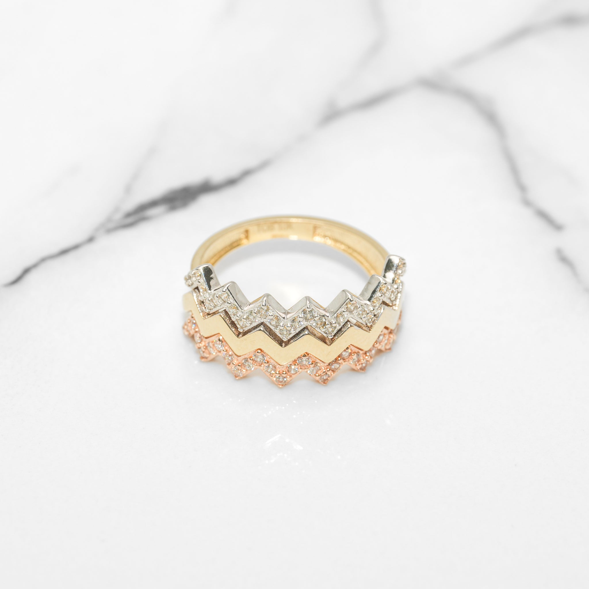 Cette bague en or 10K tricolore combine des motifs en zigzag ornés de cz, pour un style audacieux et élégant qui attire tous les regards.