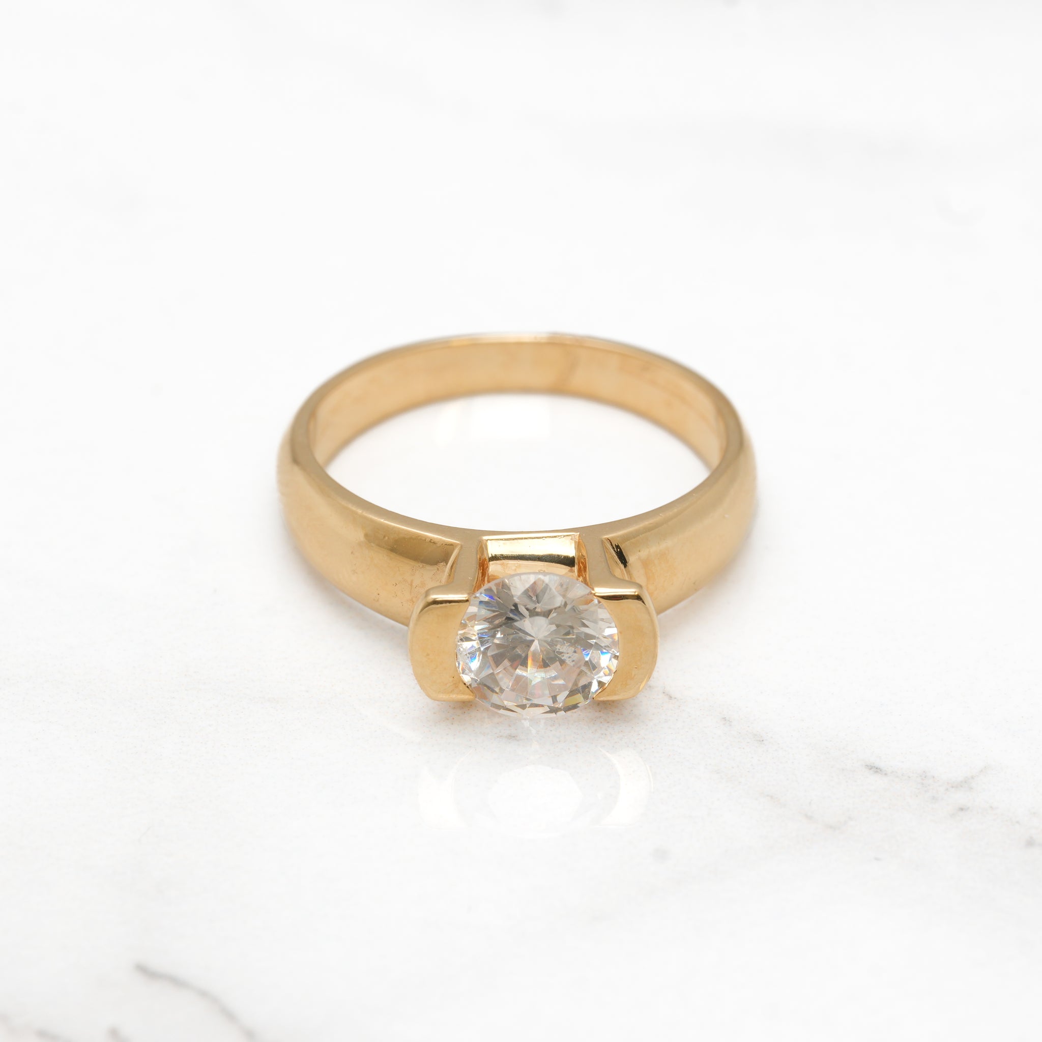 Cette bague en or jaune 14K présente un solitaire en cz de coupe brillant monté sur une monture polie.