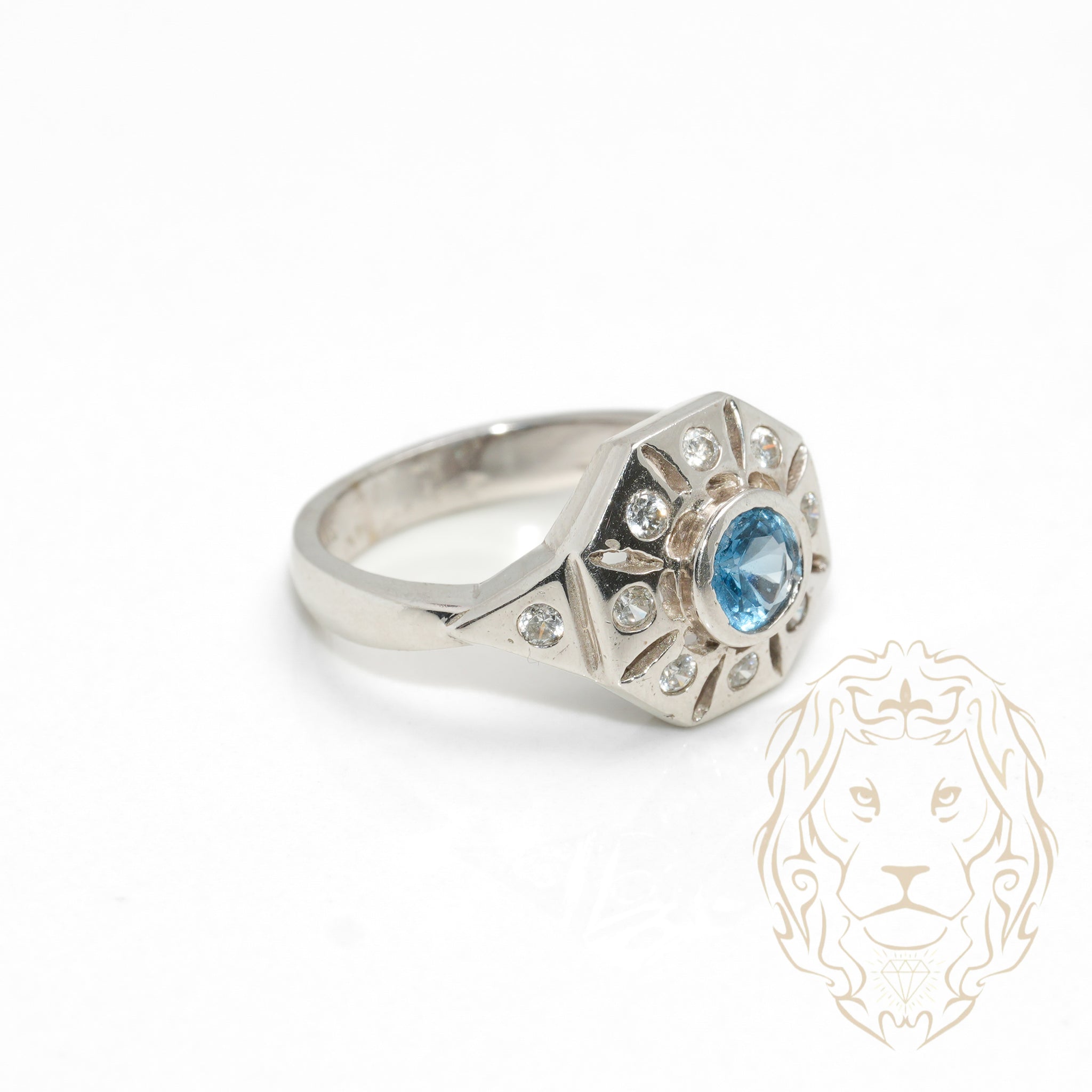 Cette bague en or blanc 10K met en valeur une topaze délicate accompagnée de diamants naturels, pour un look lumineux et raffiné.