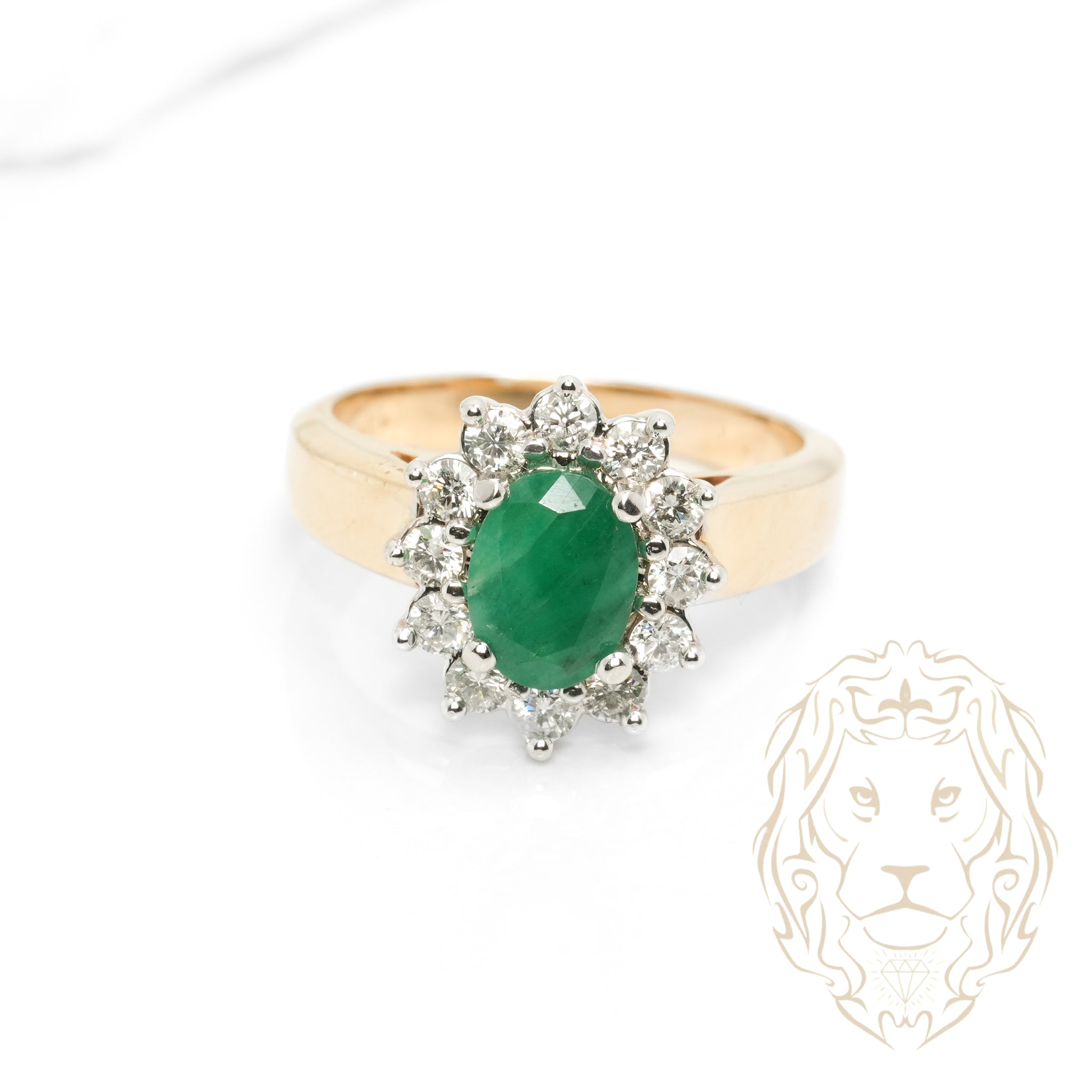 Cette bague en or 10K deux tons met en valeur une émeraude ovale entourée de diamants naturels totalisant 0.25TCW.