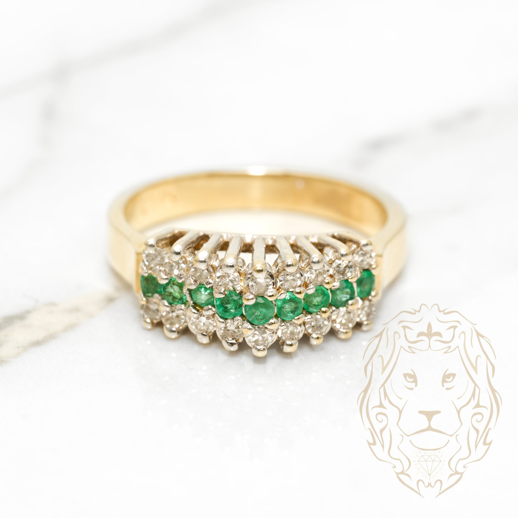 Cette bague en or deux tons 14K, ornée d'une pyramide sertie de 0.15CT d'émeraudes et 0.30CT de diamants naturels, offre un style distinctif et élégant.