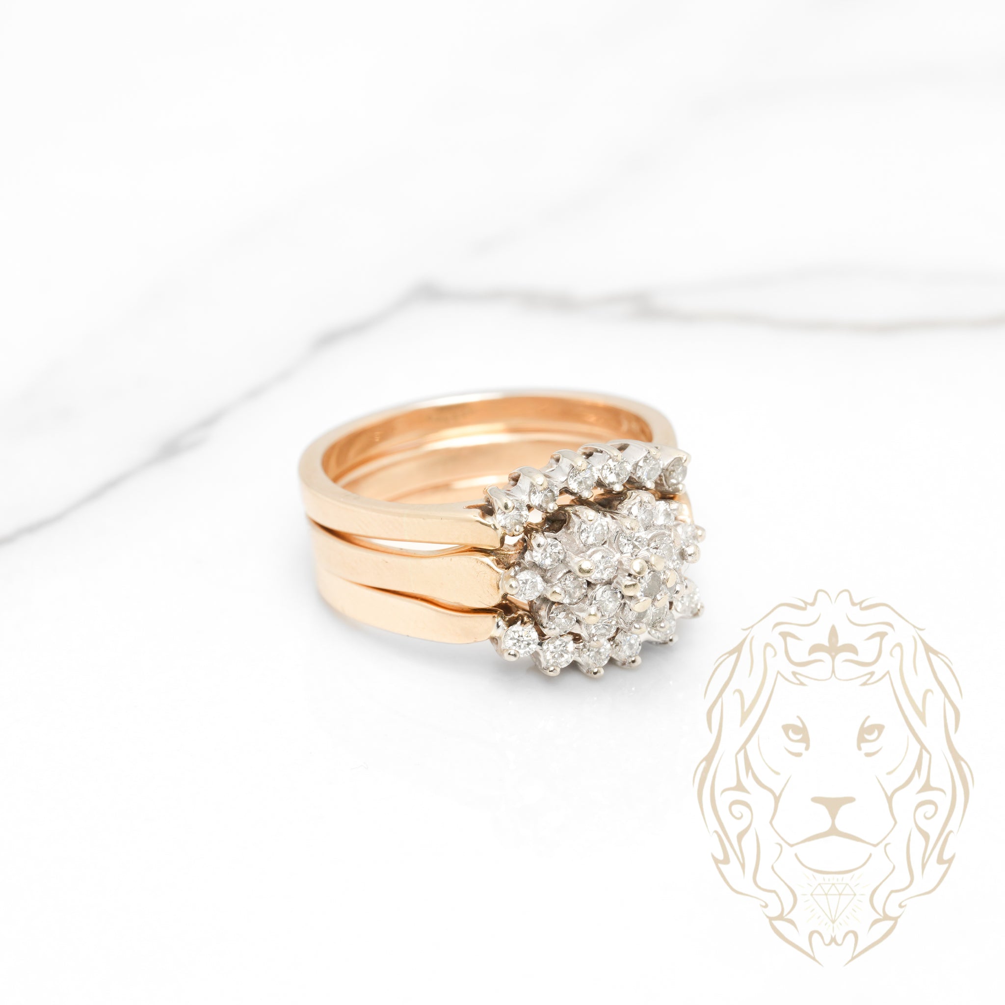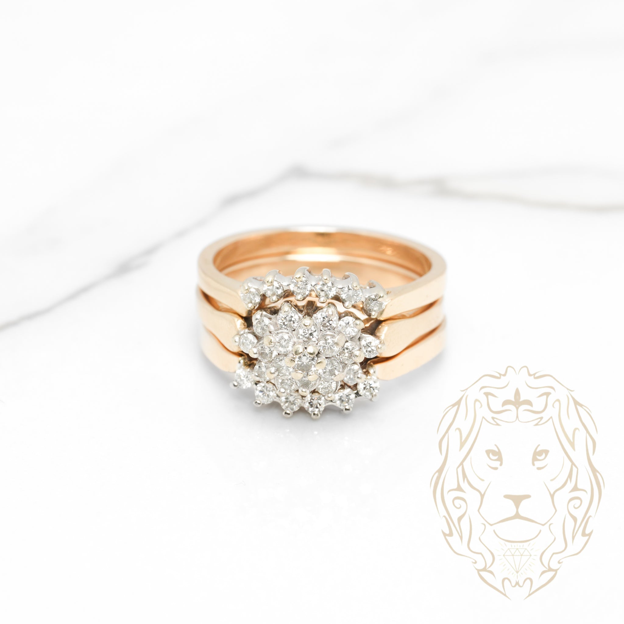 Ce somptueux ensemble de mariage en or 14K deux tons comprend une bague de fiançailles en grappe de diamants naturels totalisant 1.00TCW, accompagnée de deux alliances assorties. Un trio harmonieux conçu pour célébrer l’amour.