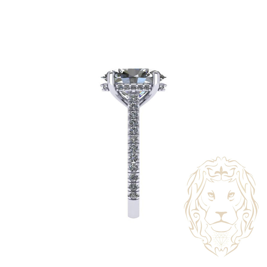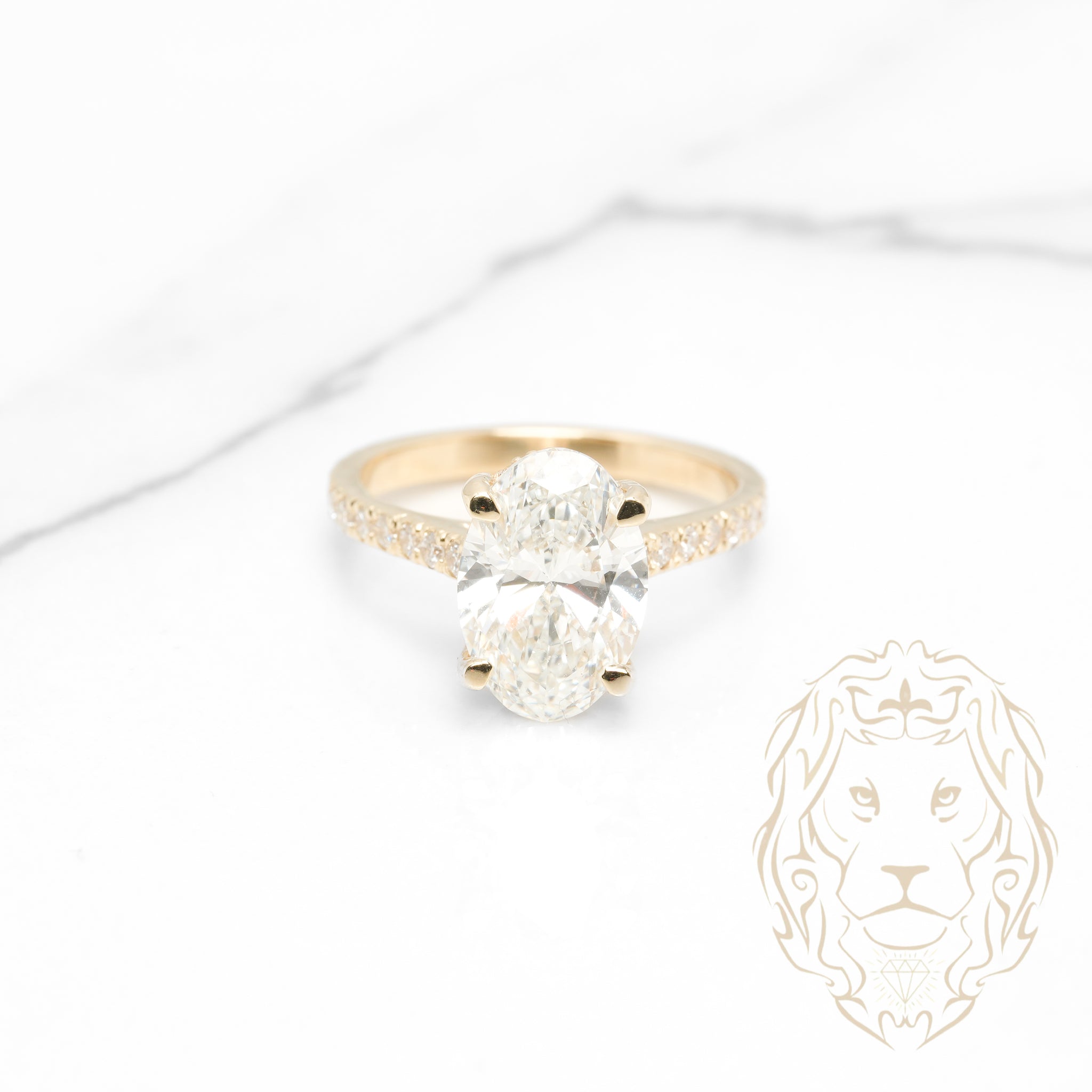 Cette bague de fiançailles en or jaune 14K est sertie d’un diamant de laboratoire VS1 de 3.02CT taillé en ovale, accompagné d’un halo caché et d’une monture pavée totalisant 0.37TCW.