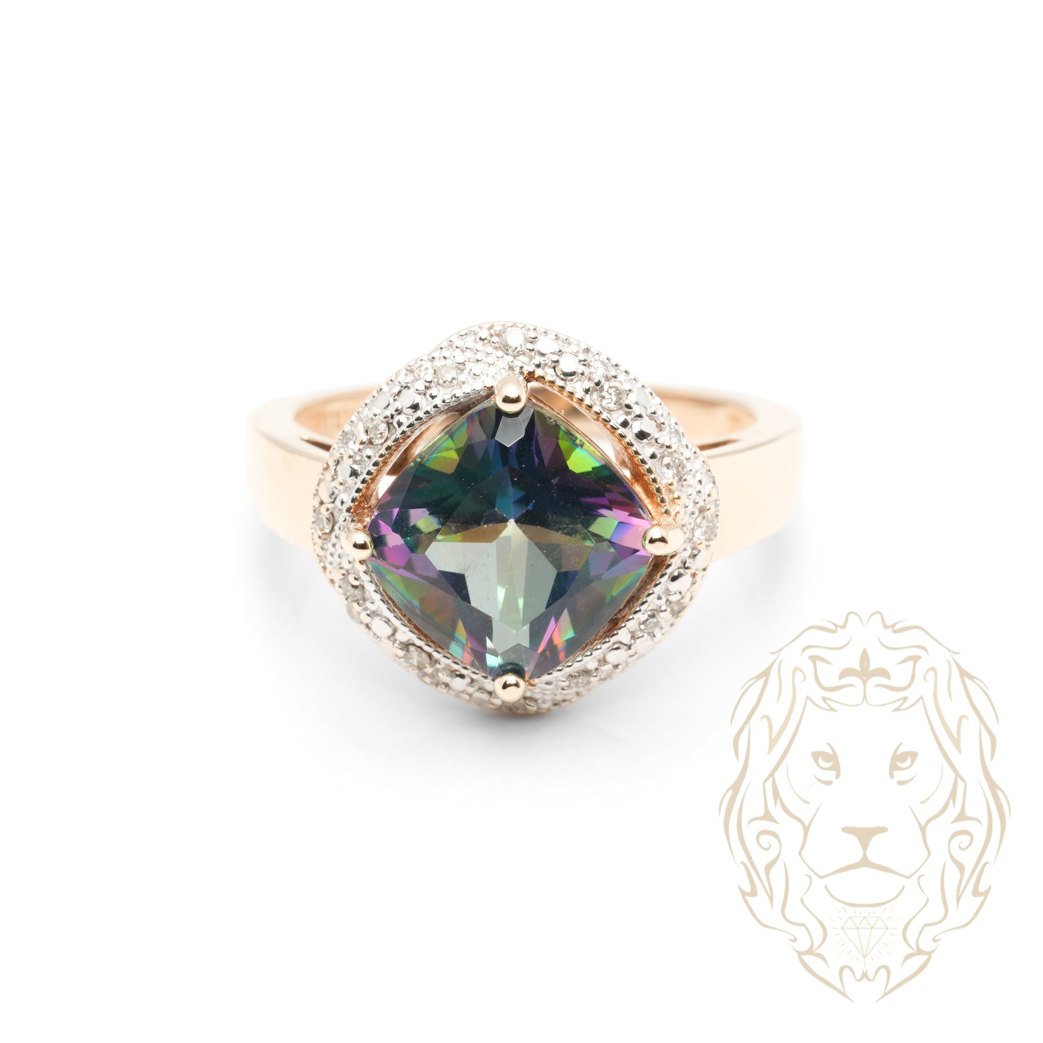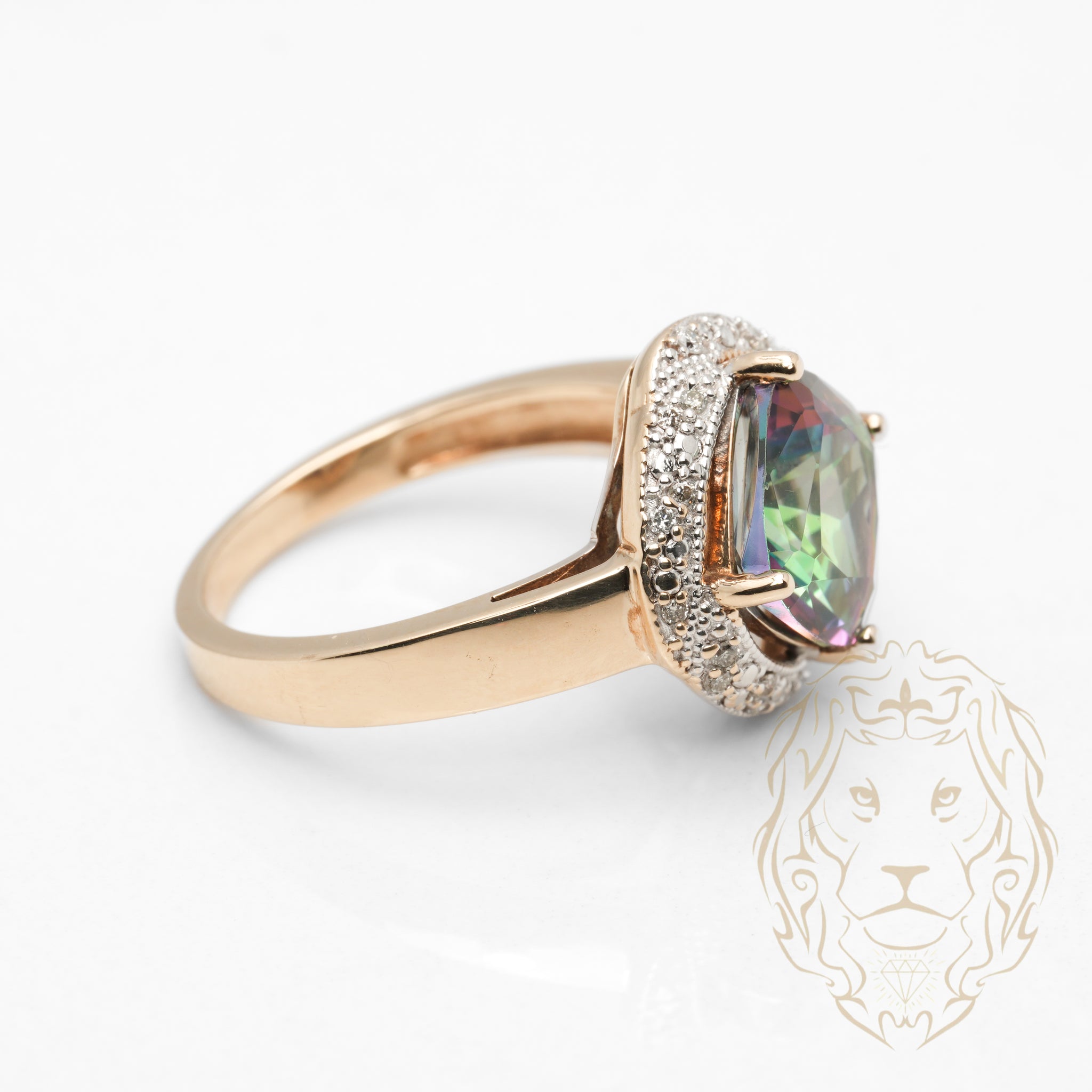 Bague de fiançailles en or 10K deux tons, mettant en valeur une topaze mystique entourée d’un halo de diamants naturels totalisant 0.10CT. Un design vibrant et unique qui capte toutes les nuances de lumière.