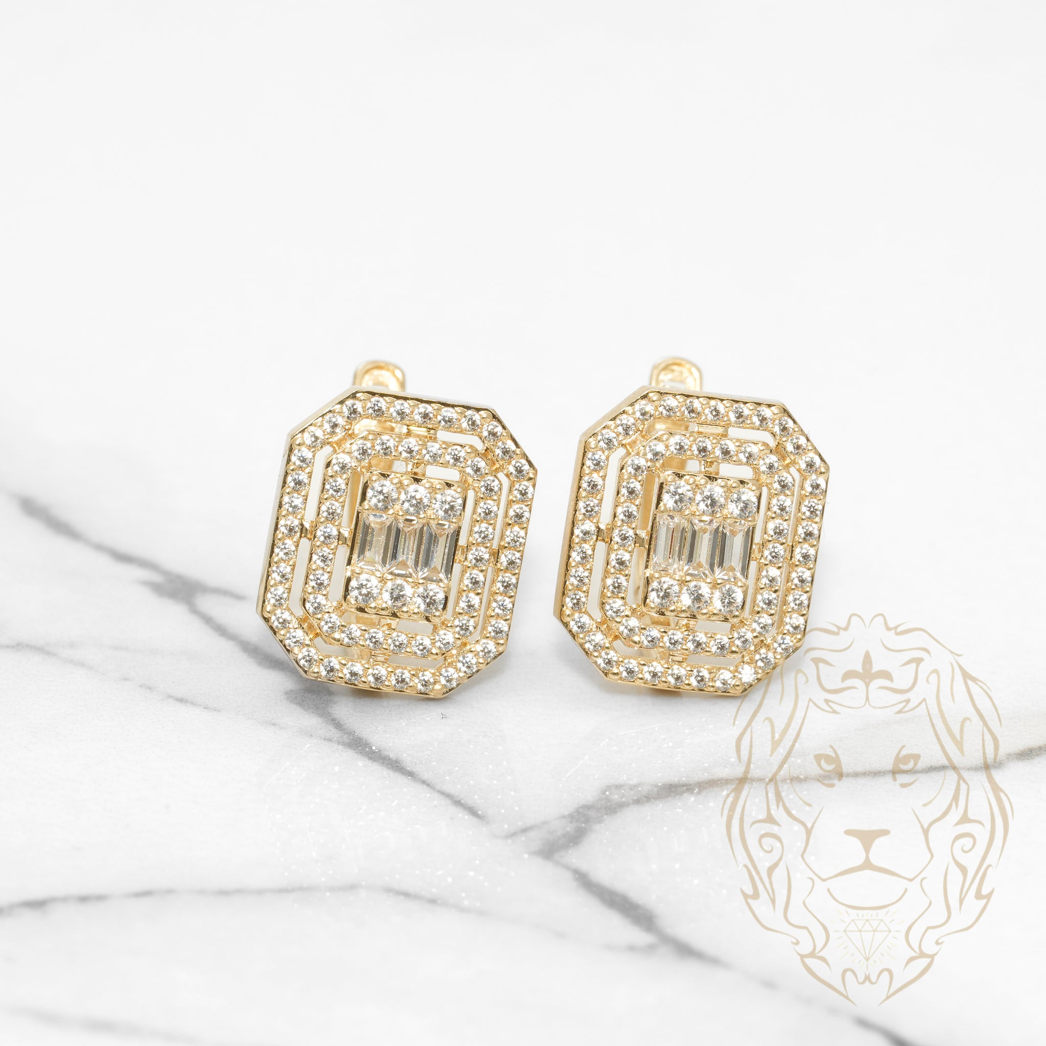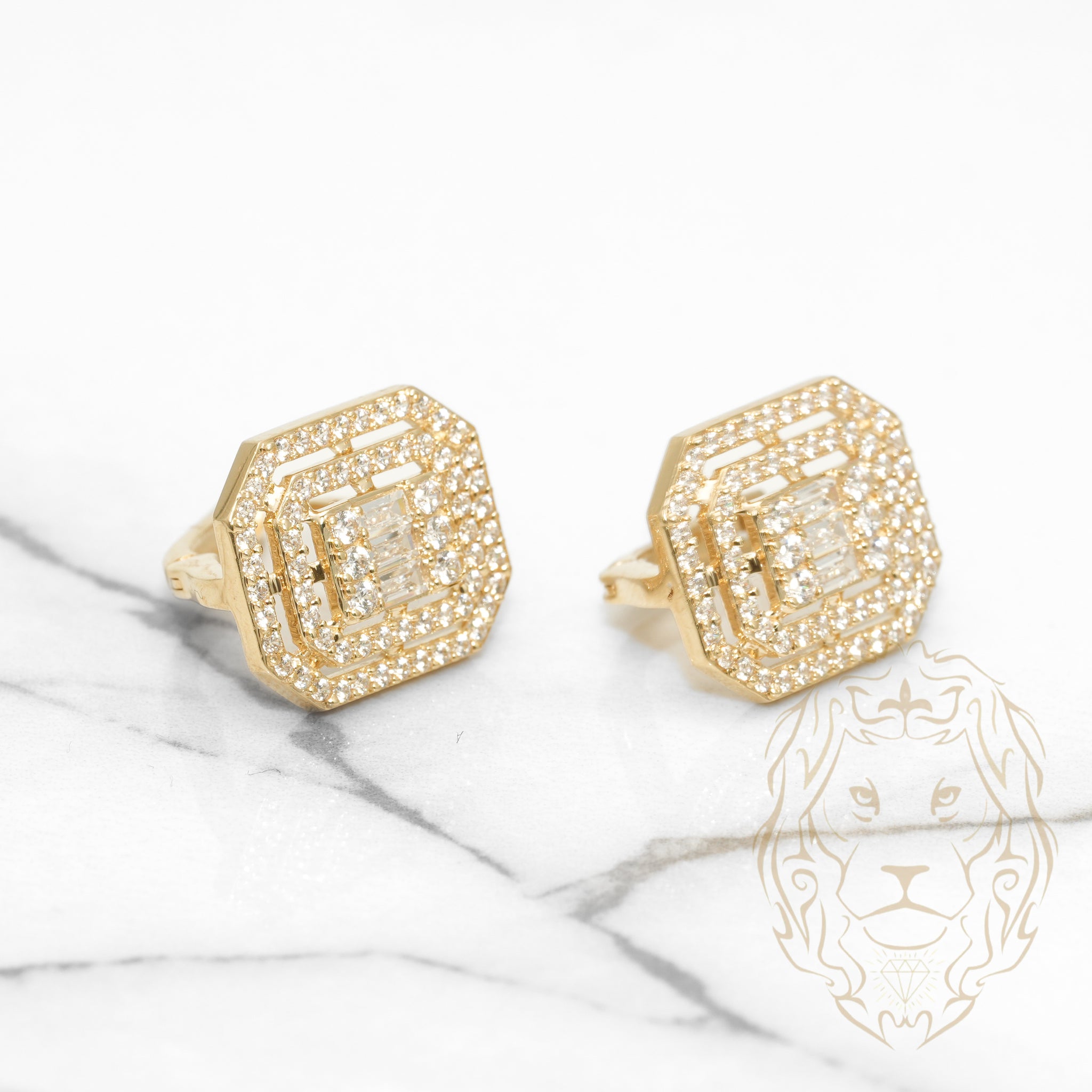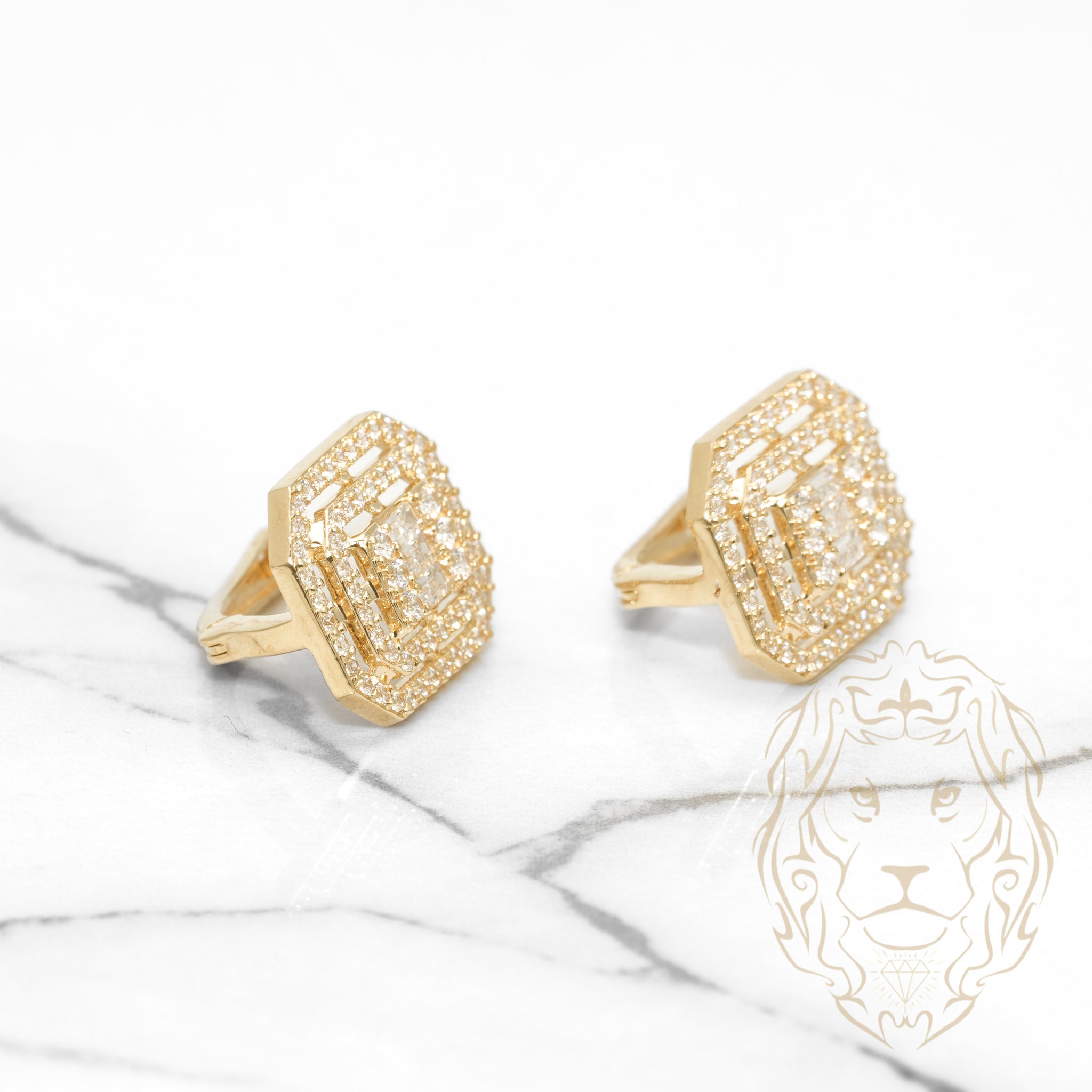 Ces huggies en or jaune 10K, ornés d’un double halo octogonal pavé de cz ronds et baguettes, sont parfaits pour un style chic et raffiné.