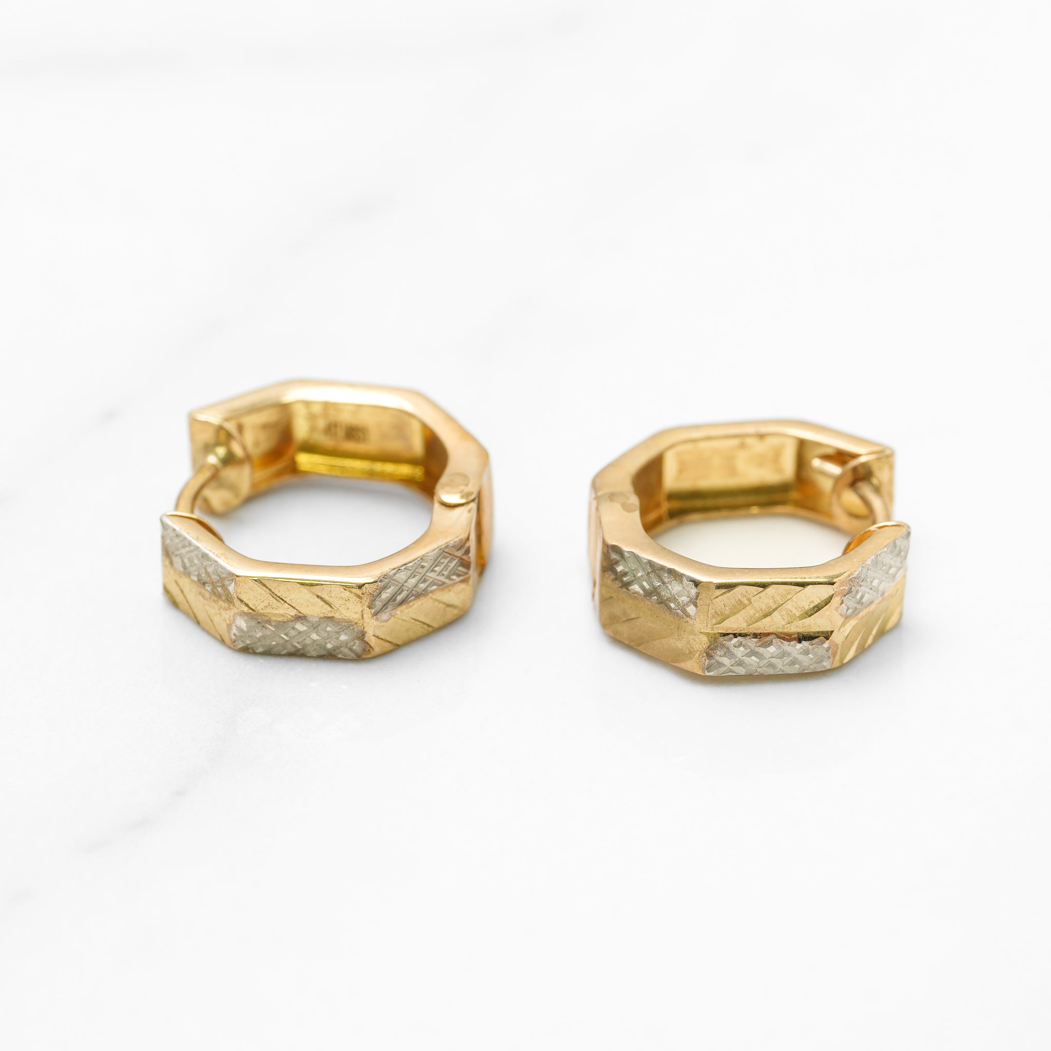 Ces huggies en or 10K deux tons jaune et blanc combinent un poli brillant avec une coupe diamant, créant un bijou à la fois sophistiqué et moderne. Parfaites pour ajouter une touche de contraste élégant à votre look.