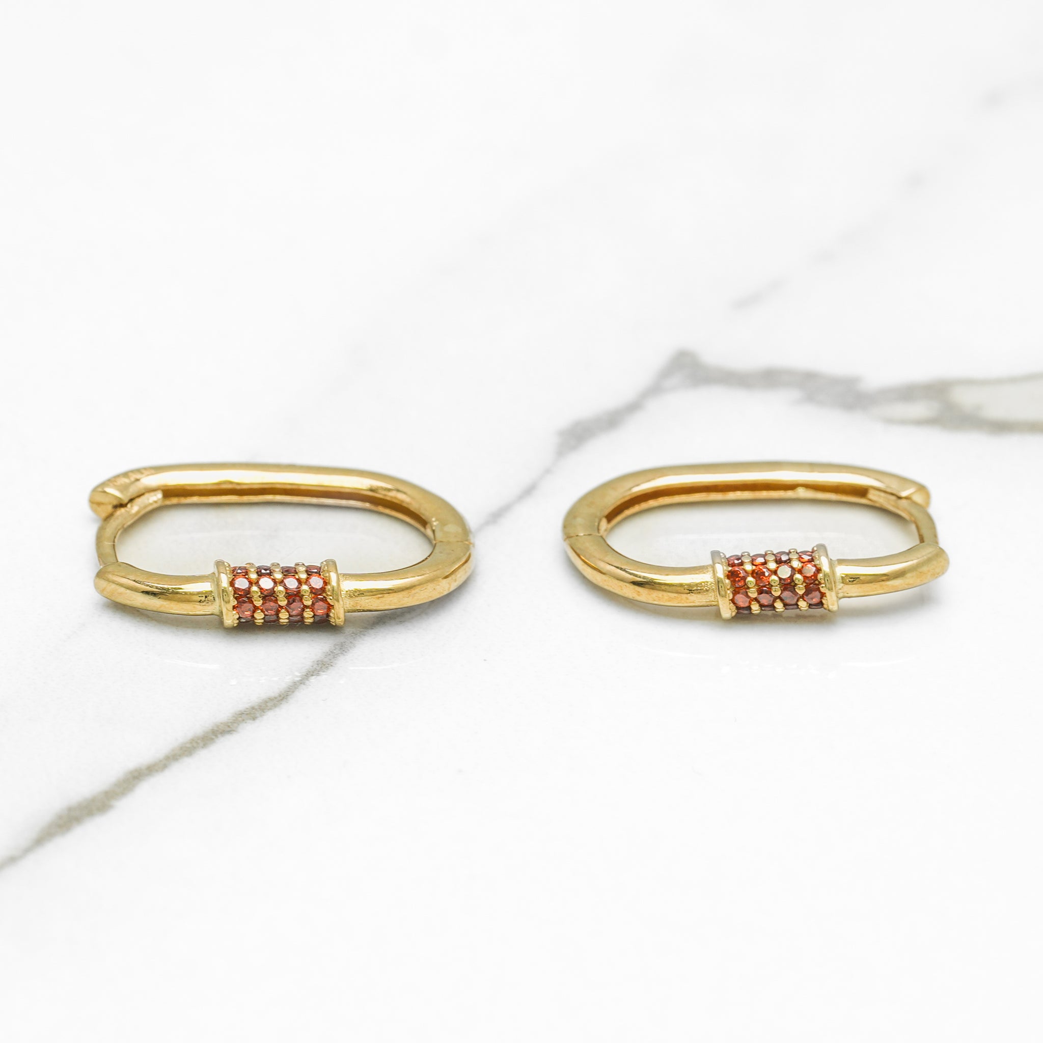 Ces huggies en or 10K jaune, en forme de paperclip et pavés de pierres cz orange, sont parfaits pour ajouter une touche de couleur et de modernité à votre style.