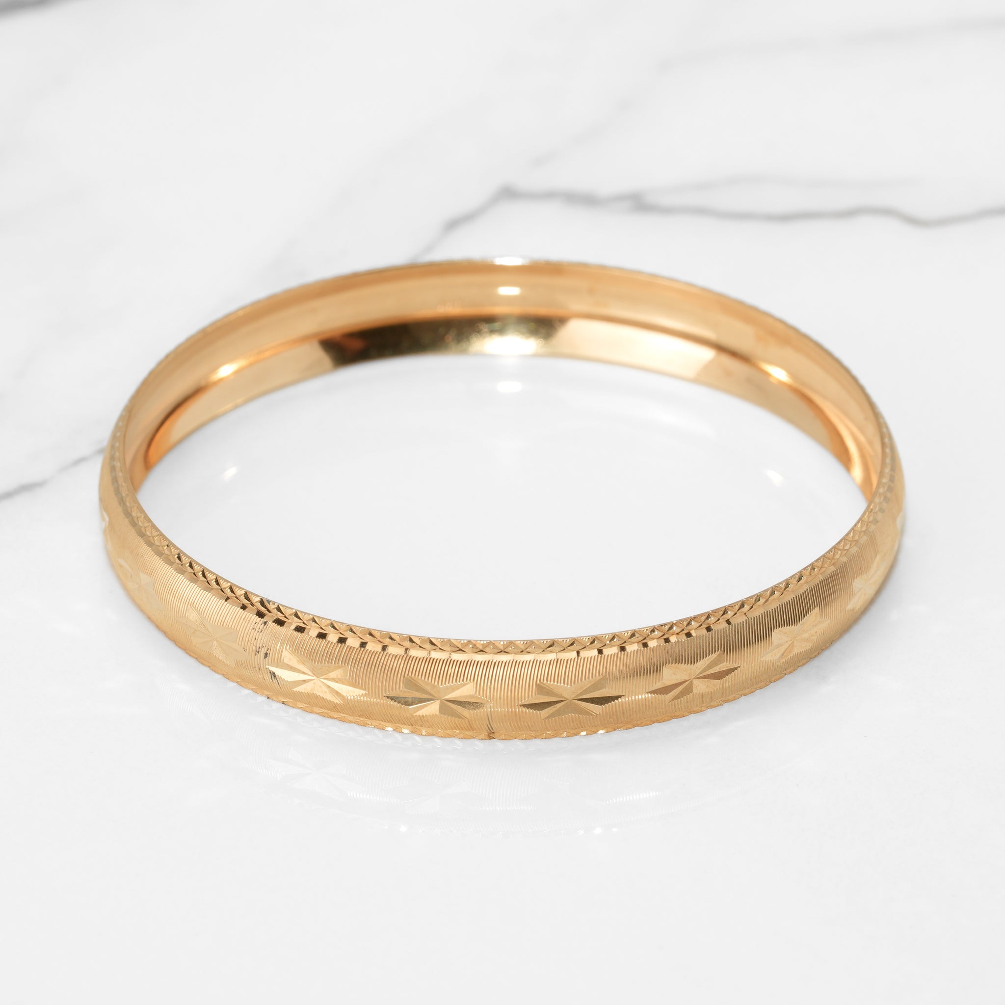 Ce bracelet jonc en or 10K jaune, gravé de motifs traditionnels et rehaussé d’une coupe diamant, est un incontournable pour celles qui aiment les détails sophistiqués.