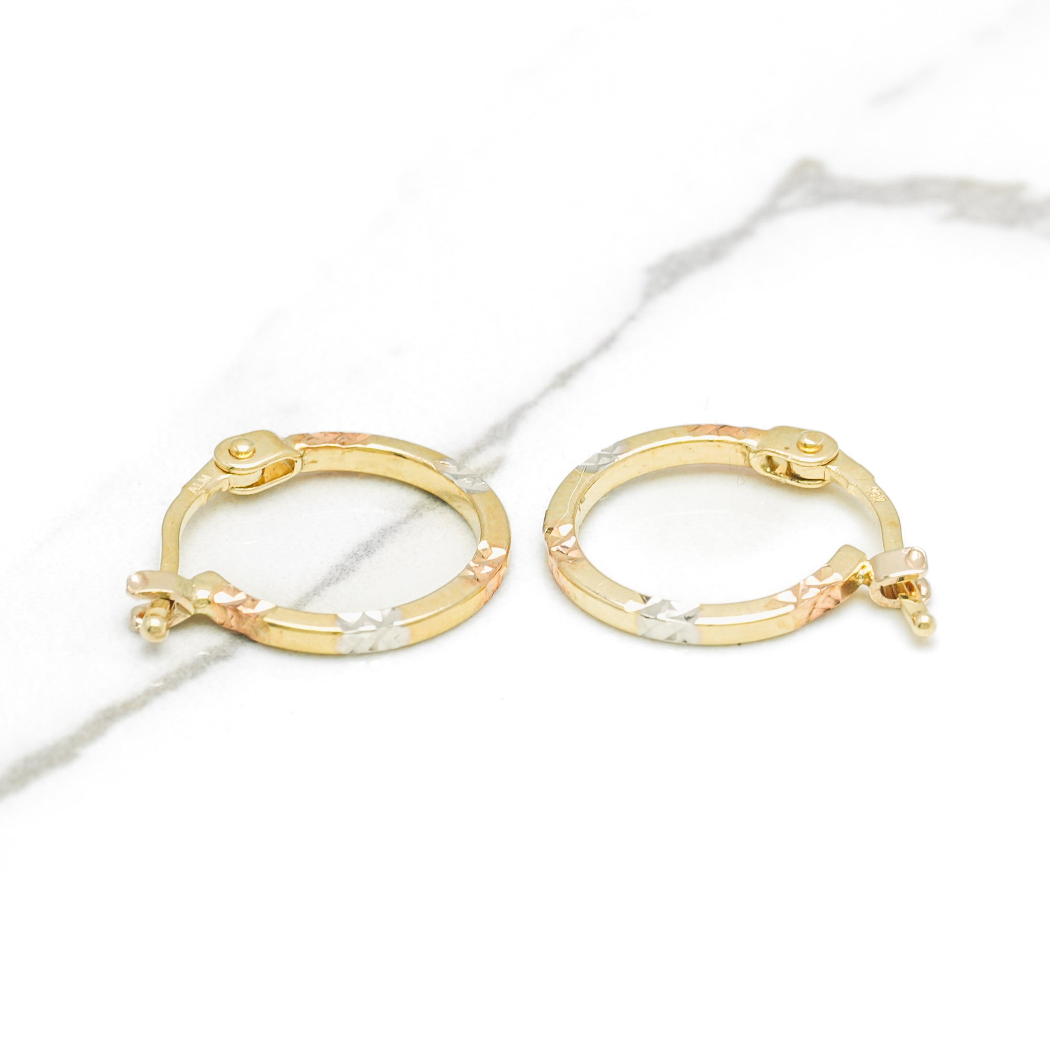 Ces huggies en or 10K tricolore, avec une coupe diamant, sont parfaits pour celles qui cherchent à ajouter une touche de sophistication colorée à leur collection de bijoux.
