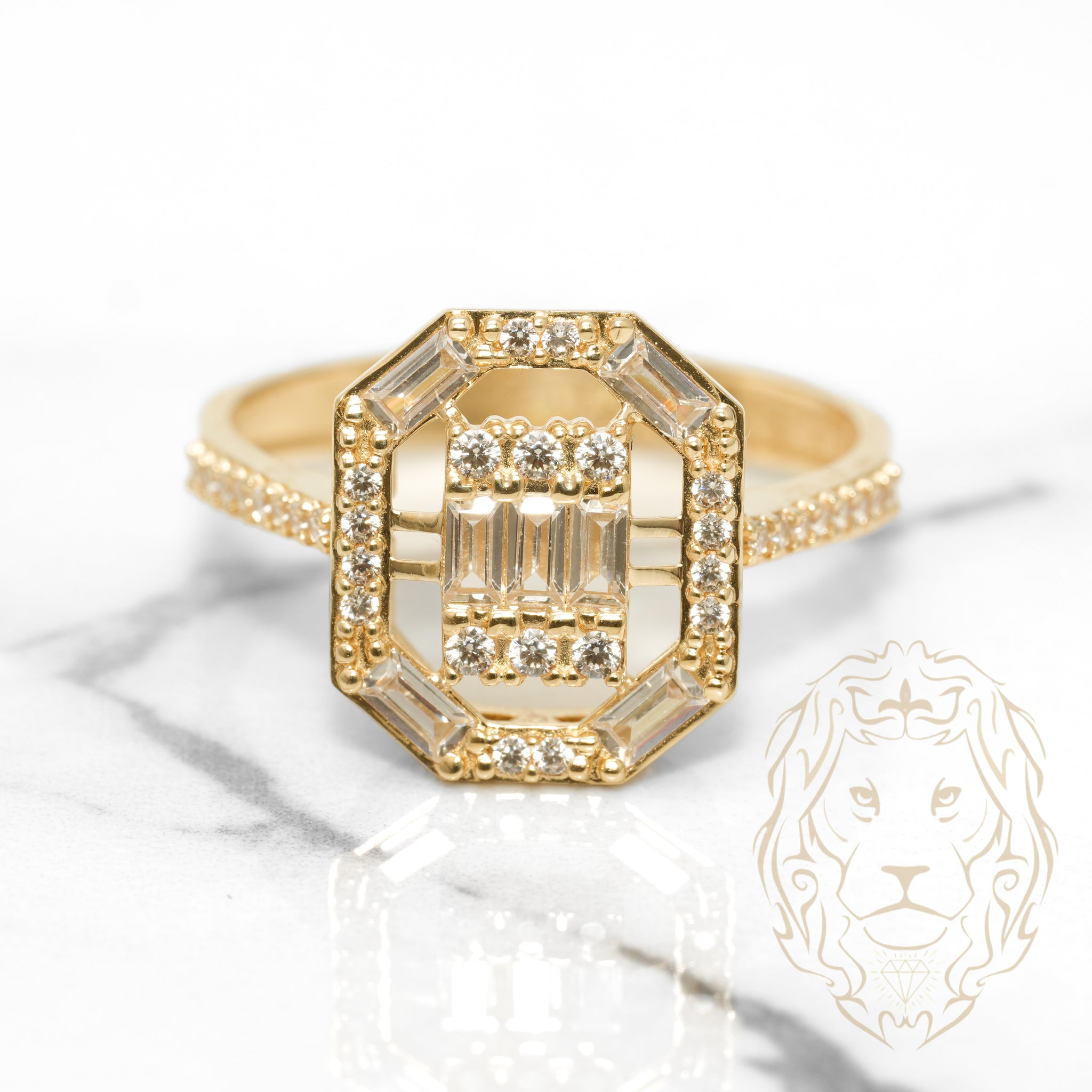 Bague cocktail - Or 10K jaune halo espacé octogonal pavé cz rond & baguette - RIG512