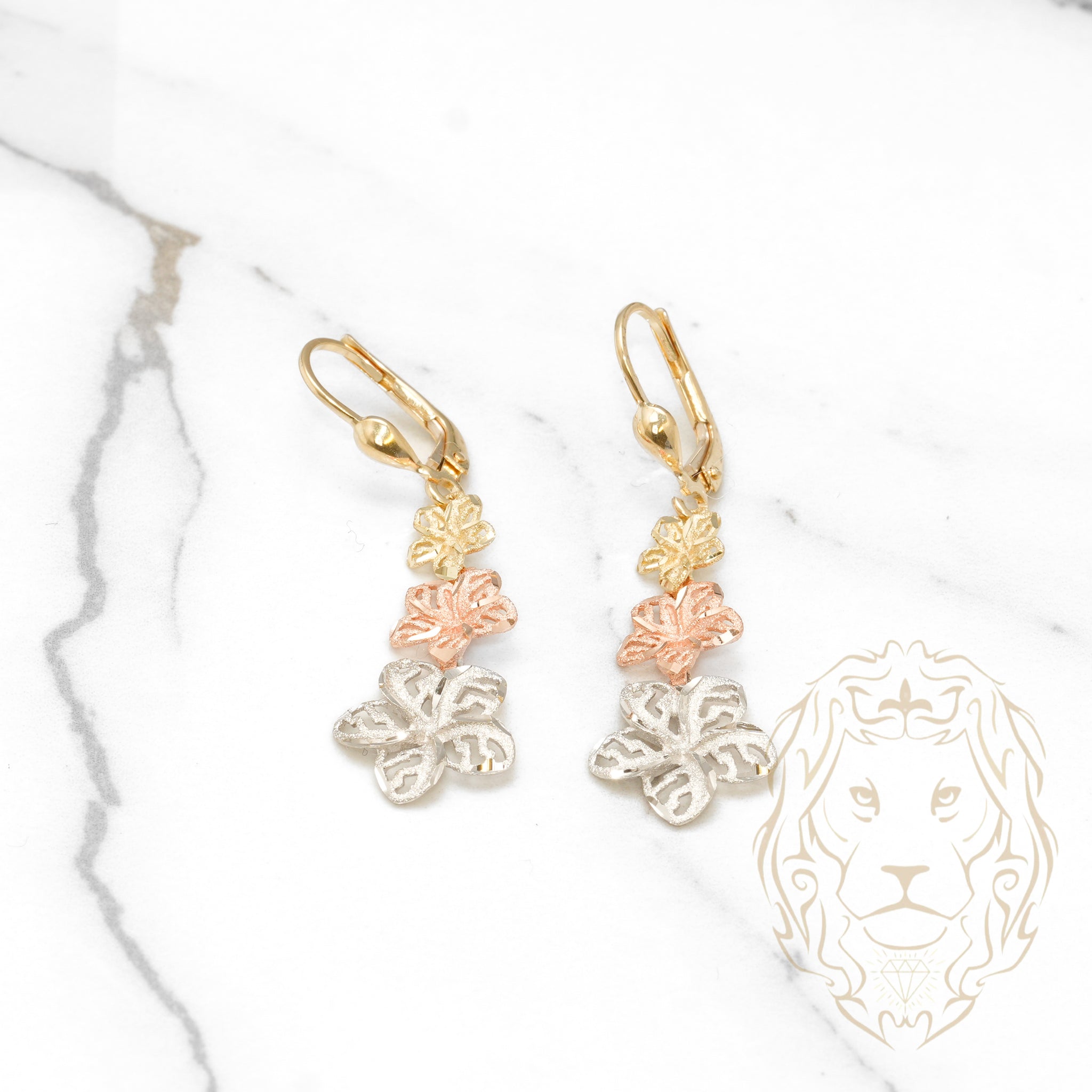 Ces hoops en or 10K tricolore, avec des motifs floraux et une coupe diamant, offrent un design unique et raffiné.