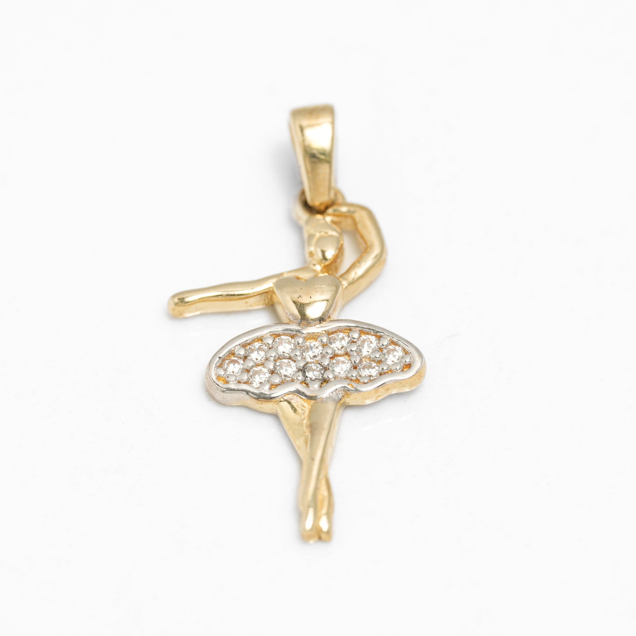 Ce pendentif en or 10K deux tons, jaune et blanc, représentant une ballerine pavée de cz, capture la grâce et l'élégance du ballet. Parfait pour les amateurs de danse et de beauté raffinée.