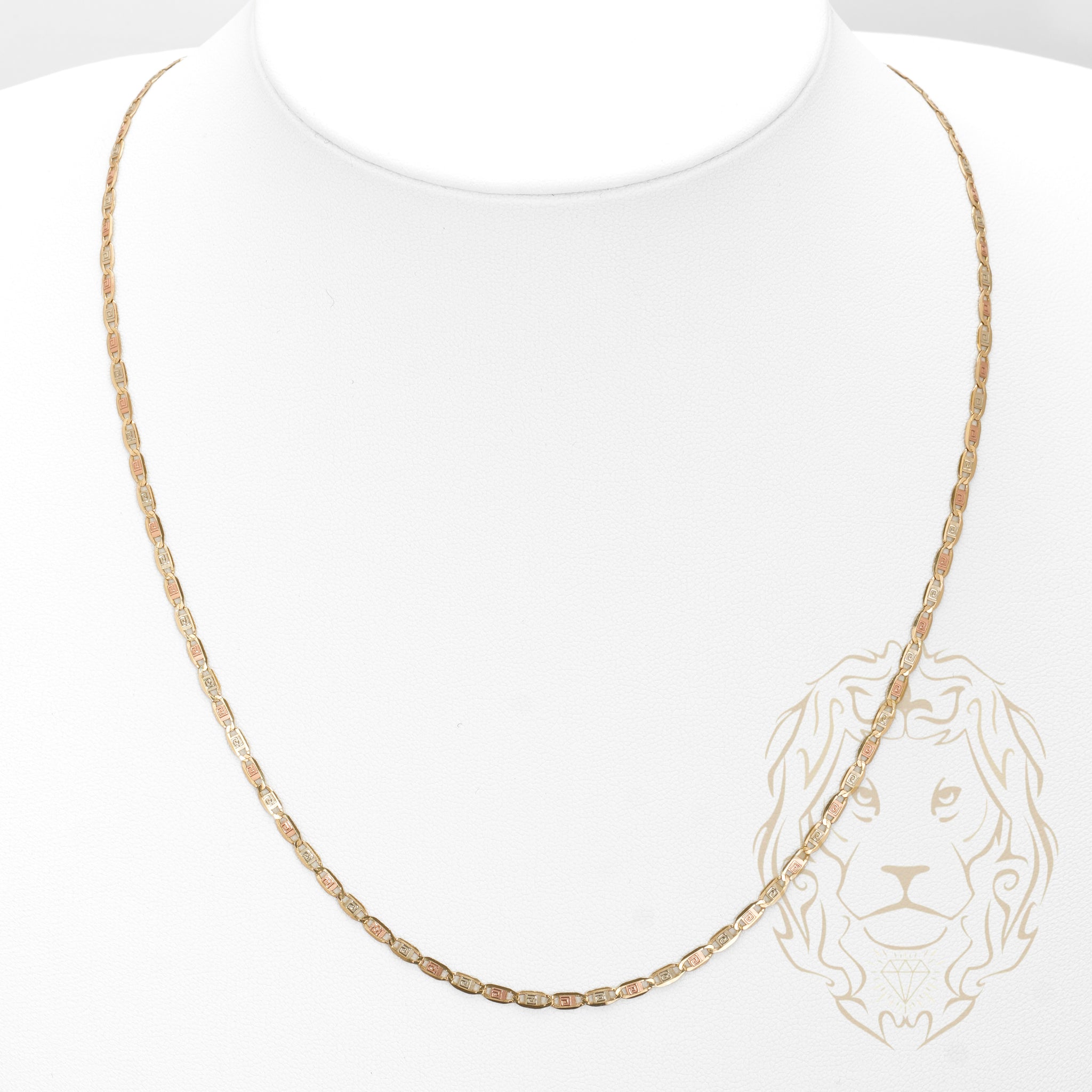 Cette chaîne en or 10K tricolore de 21 pouces avec des maillons marin et un motif clé grecque est l’incarnation du style et de la tradition méditerranéenne.