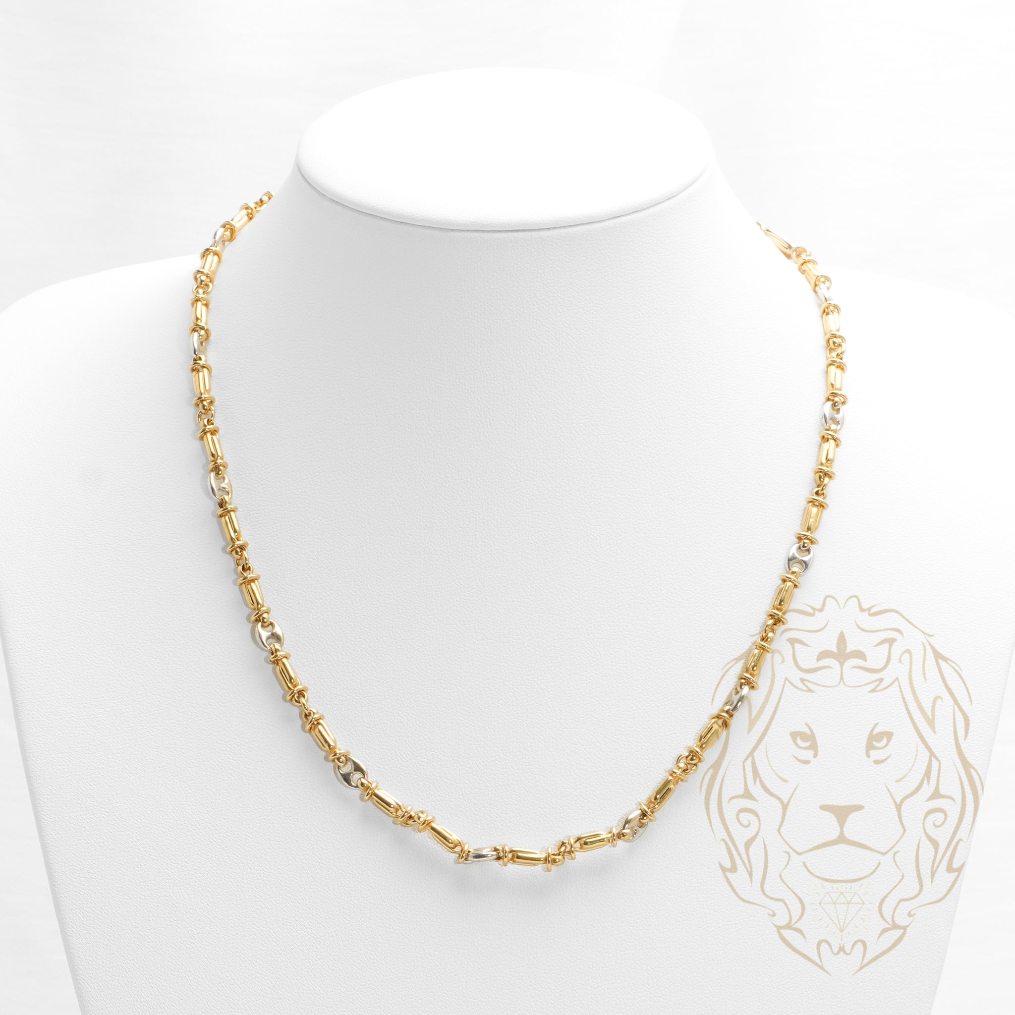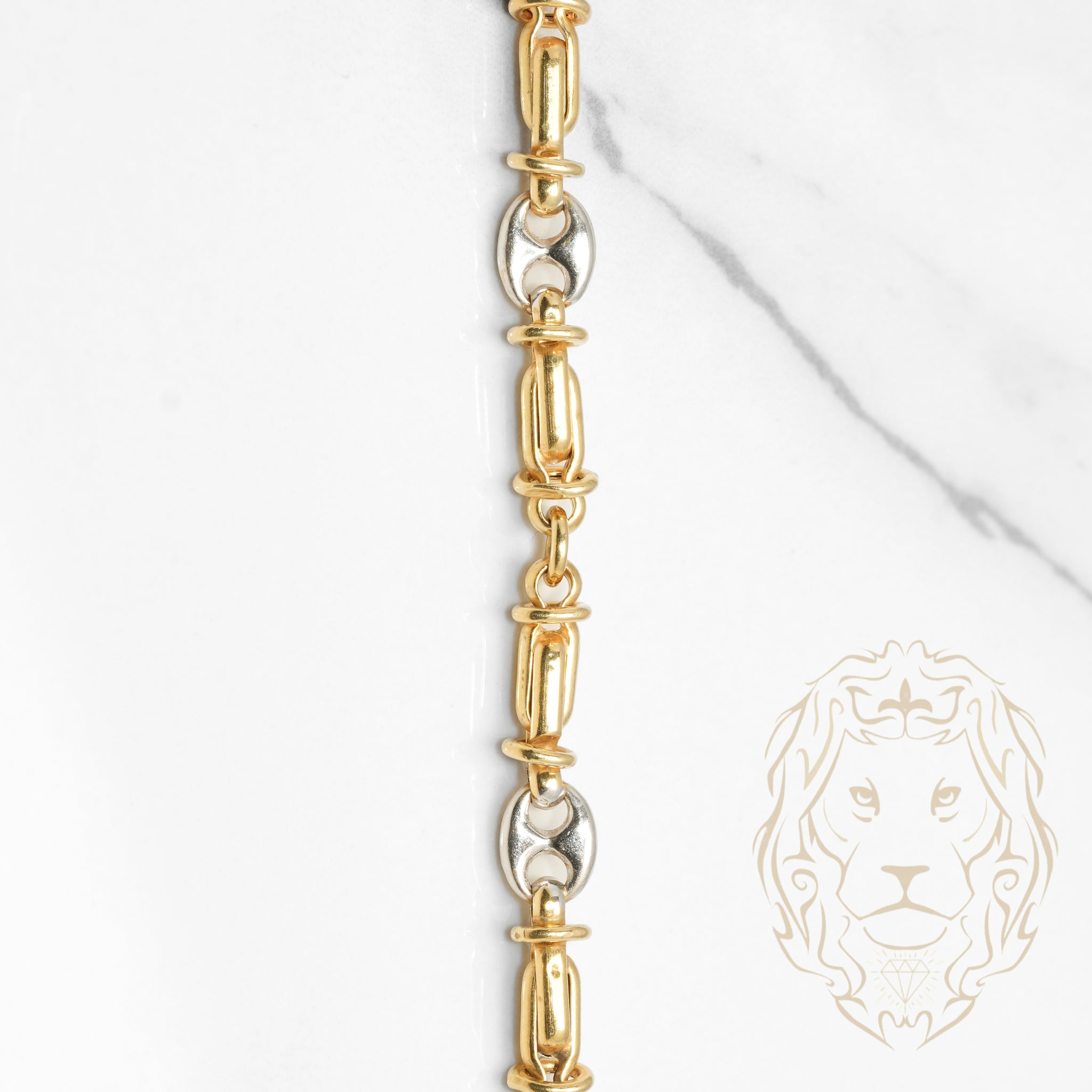 Une chaîne unique en or 18K combinant des maillons ancre gonflés et bullet dans un jeu de jaune et blanc, pour un look contemporain et original.