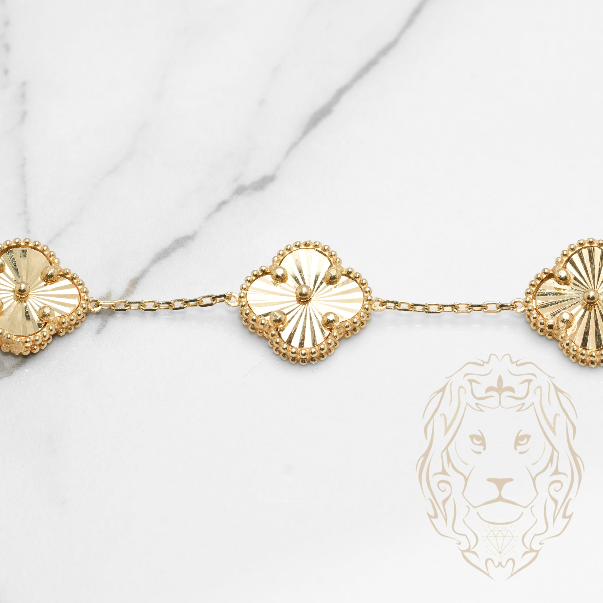 Ce bracelet en or jaune 10K de 14mm présente des trèfles guillochés qui captent la lumière avec subtilité et élégance.