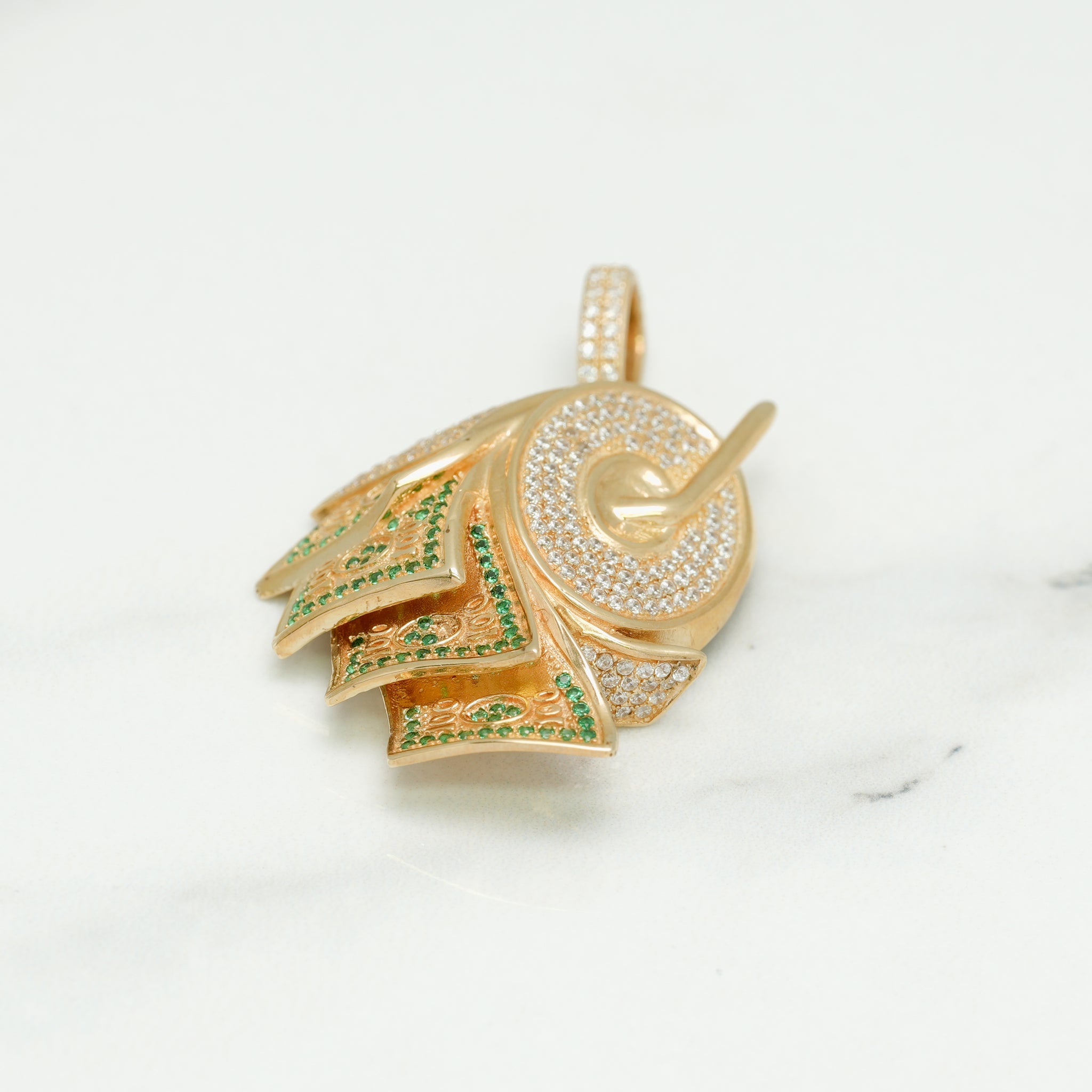 Ce pendentif en or 10K jaune, en forme de rouleau d'argent pavé de zircones cubiques (cz), est une pièce unique et lumineuse. Idéal pour ceux qui aiment les bijoux historiques avec une touche de brillance.
