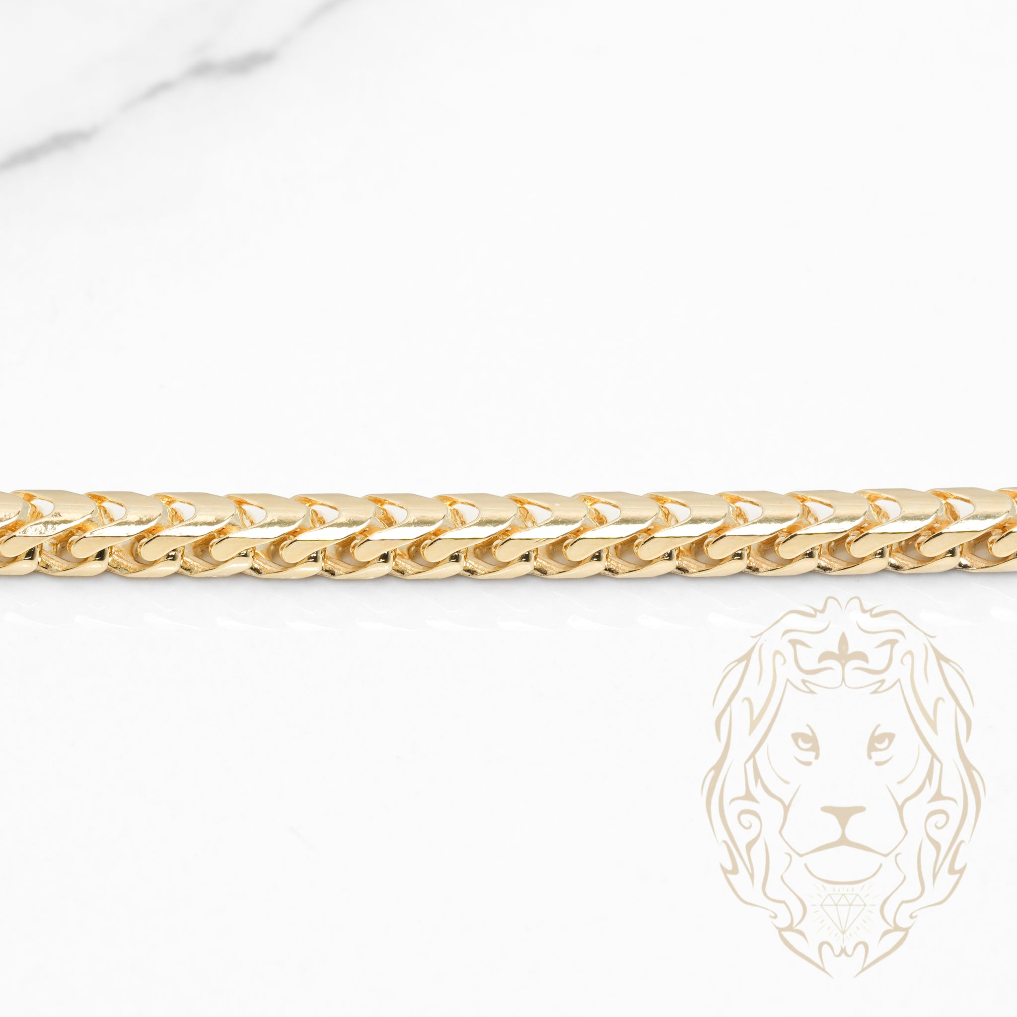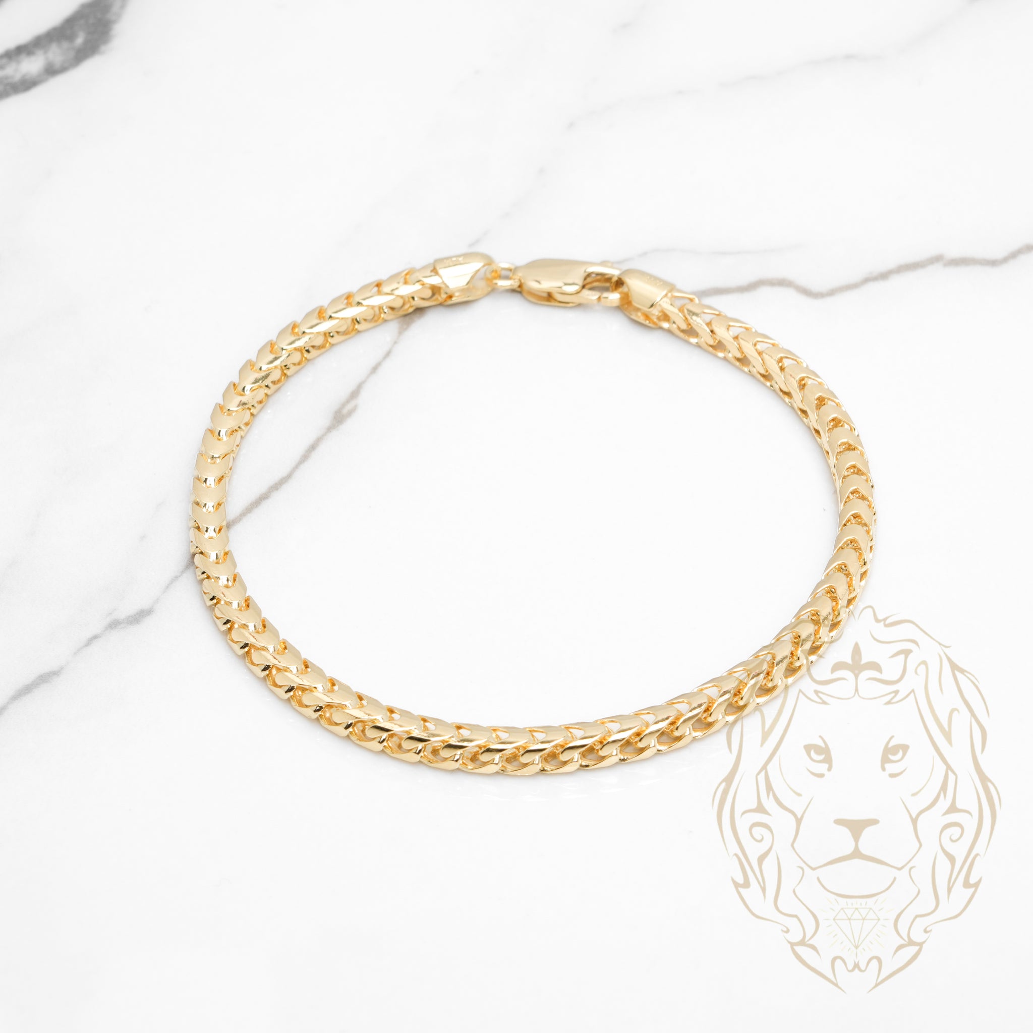 Avec sa largeur de 3.8mm, ce bracelet franco en or jaune 10K propose un excellent compromis entre finesse et caractère. Son maillage solide assure une belle tenue au poignet et une brillance constante.