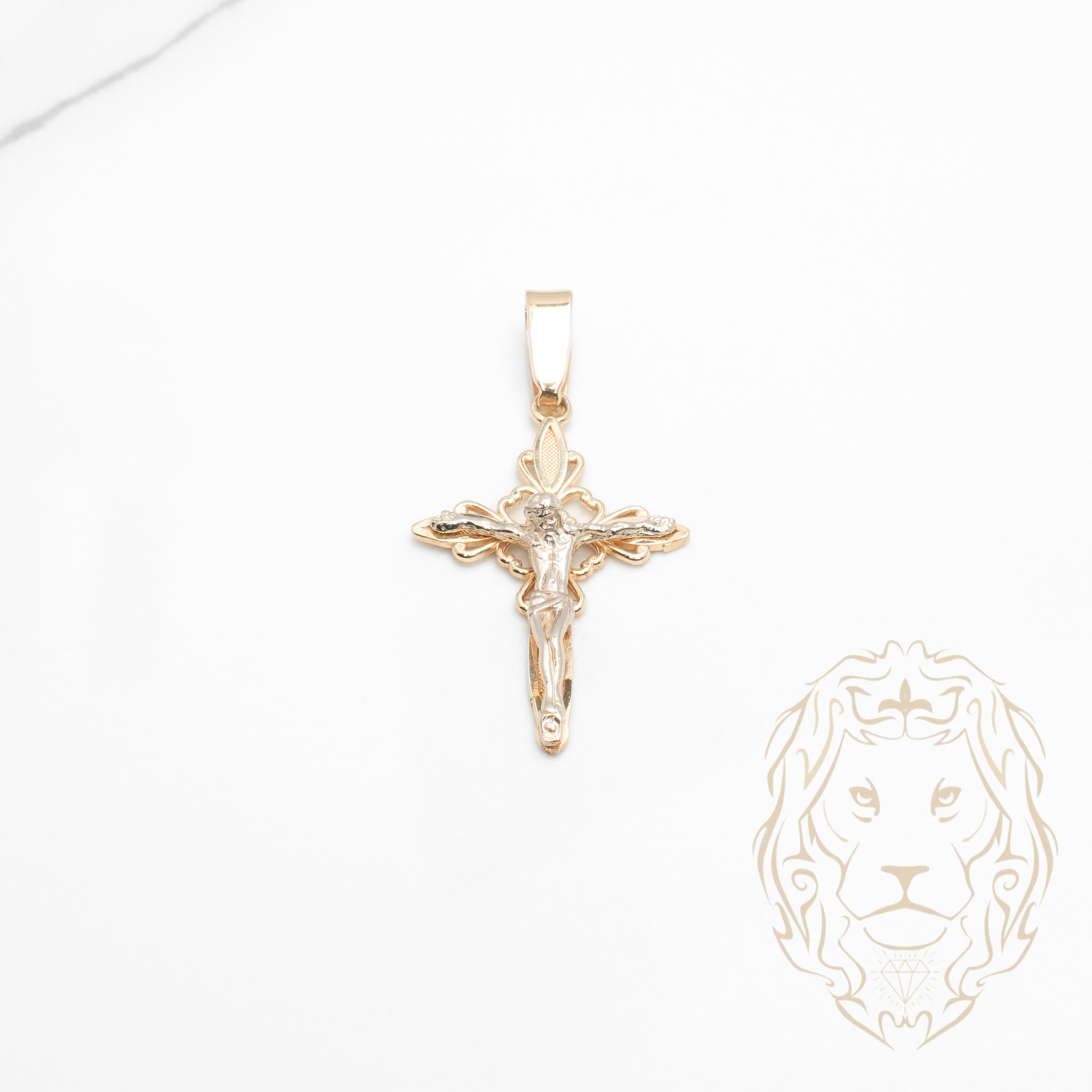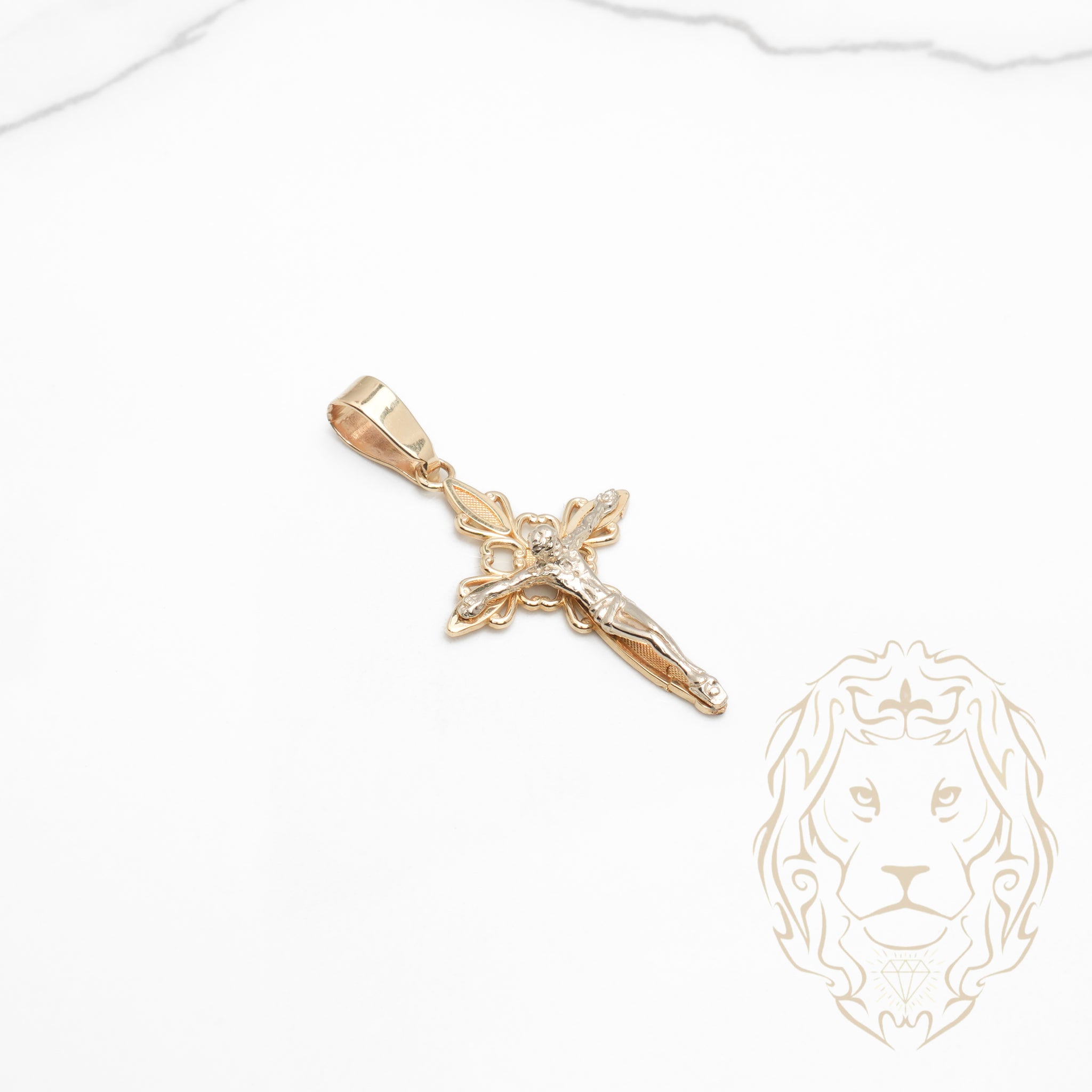 Pendentif croix en or 10K deux tons jaune et blanc, délicatement travaillé avec la figure du Christ. Élégant et spirituel.