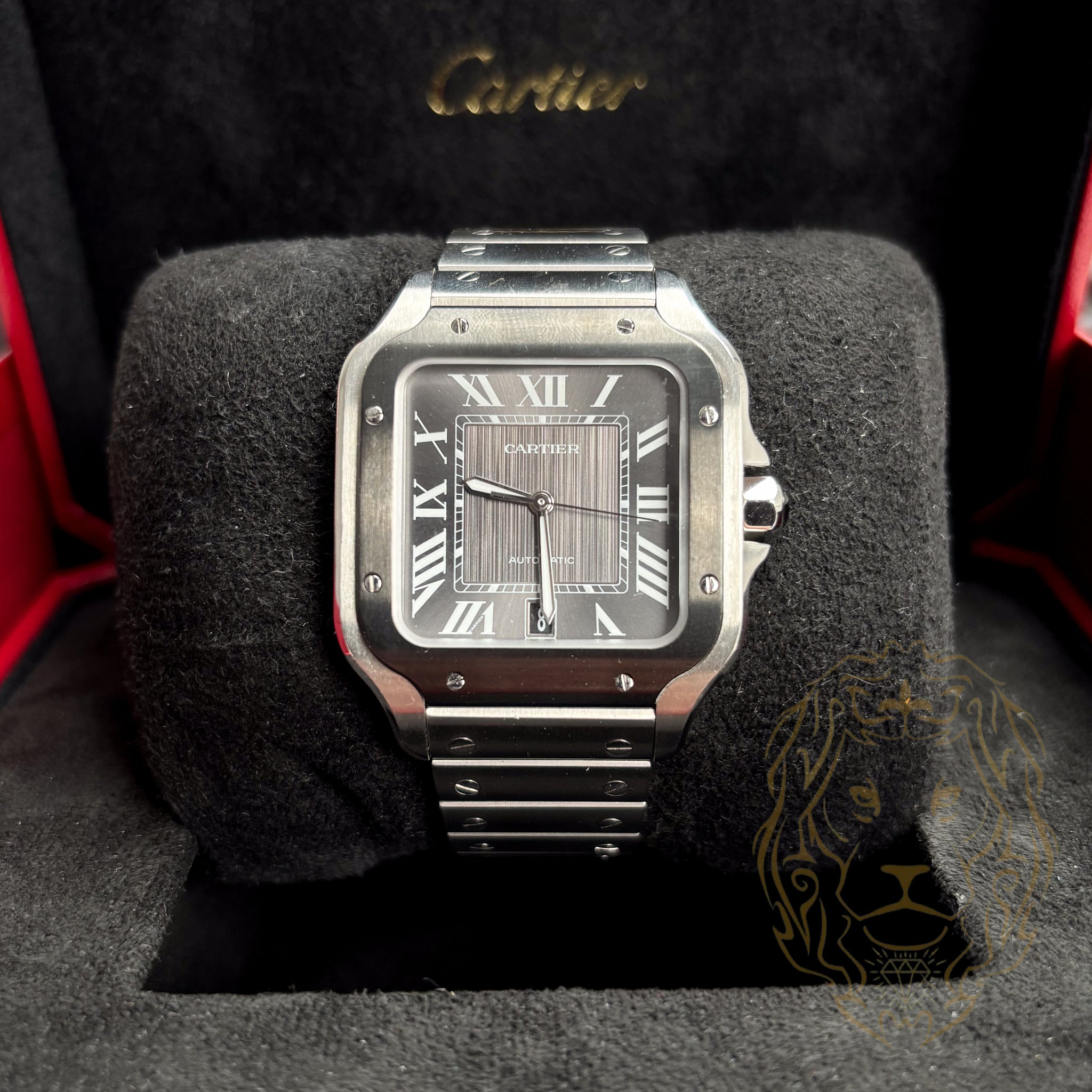 Le boîtier en acier inoxydable de 39.8 mm, alternant finitions brossées et polies, conserve la silhouette emblématique de la Santos avec sa lunette à vis apparentes, signature incontournable de la collection. Le cadran gris anthracite à effet soleil, aux nuances changeantes selon la lumière, est rehaussé de chiffres romains argentés, d’aiguilles glaive luminescentes et d’un chemin de fer minuté, offrant une lisibilité optimale et une allure résolument contemporaine.