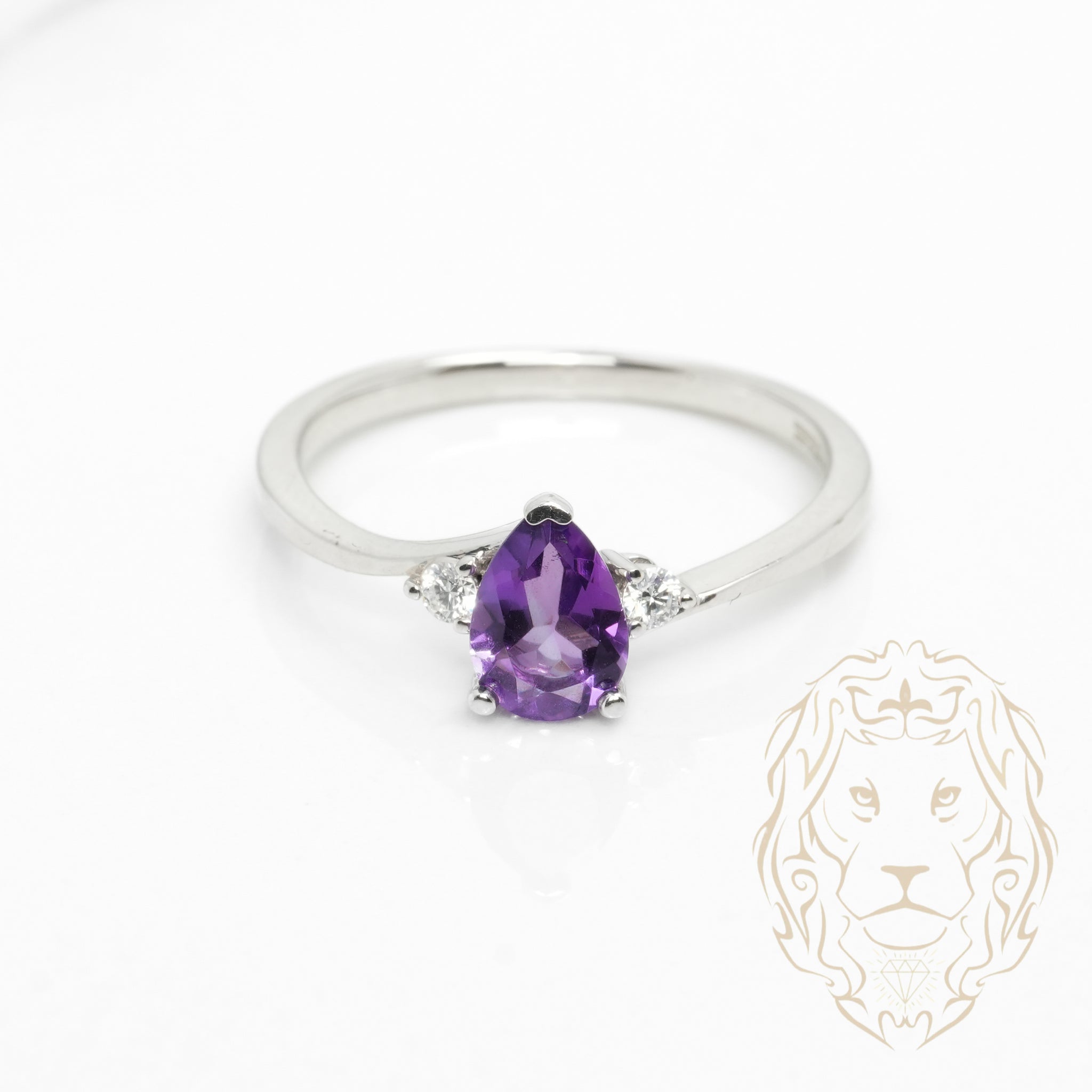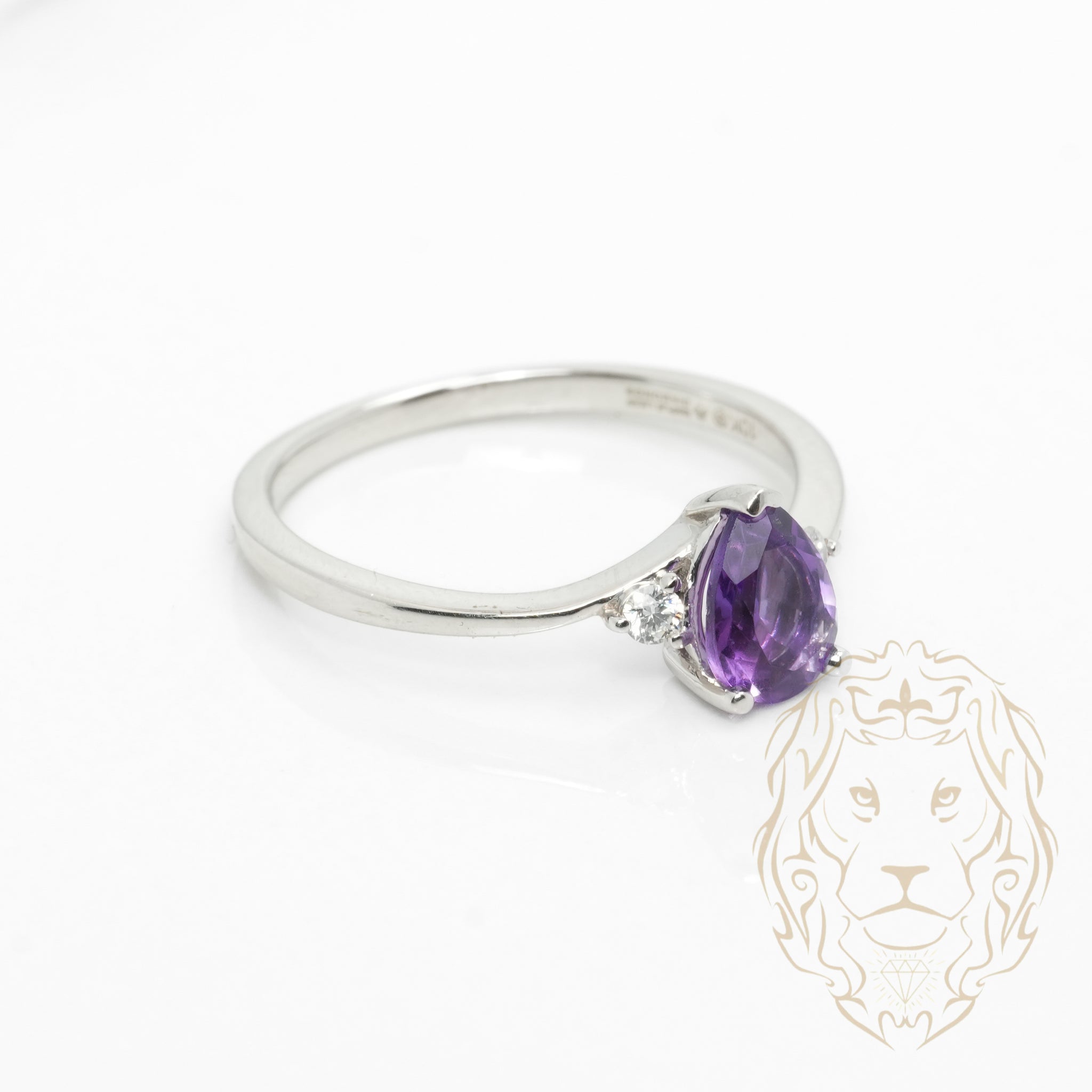 Cette bague en or 10K blanc met en vedette une améthyste coupe poire accompagnée de diamants naturels totalisant 0.08TCW.