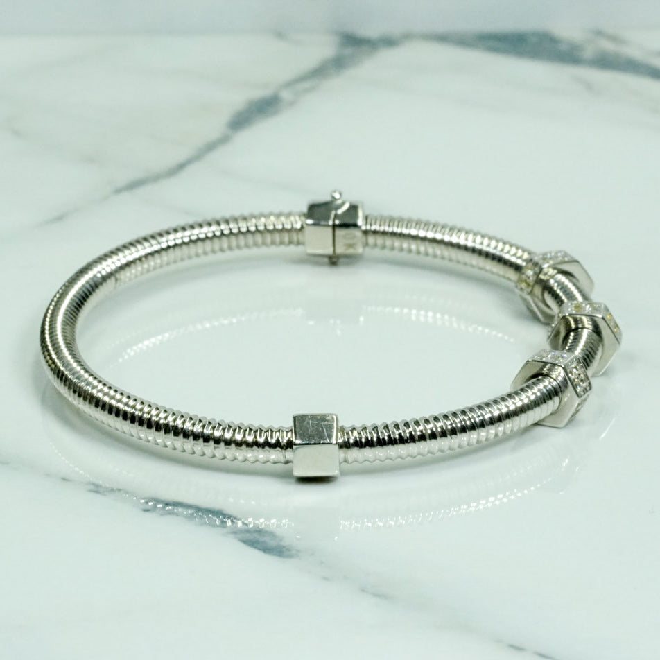Découvrez notre bracelet boulon en or blanc 10 carats, un bijou élégant et audacieux qui incarne l'alliance parfaite entre la sophistication et l'ingéniosité. Fabriqué avec soin à partir d'or blanc de haute qualité, ce bracelet arbore des écrous mobiles qui ajoutent une touche ludique et distinctive à votre style. Que vous soyez passionné de mécanique ou simplement à la recherche d'un accessoire unique, ce bracelet boulon est le choix idéal pour affirmer votre individualité avec éclat.
