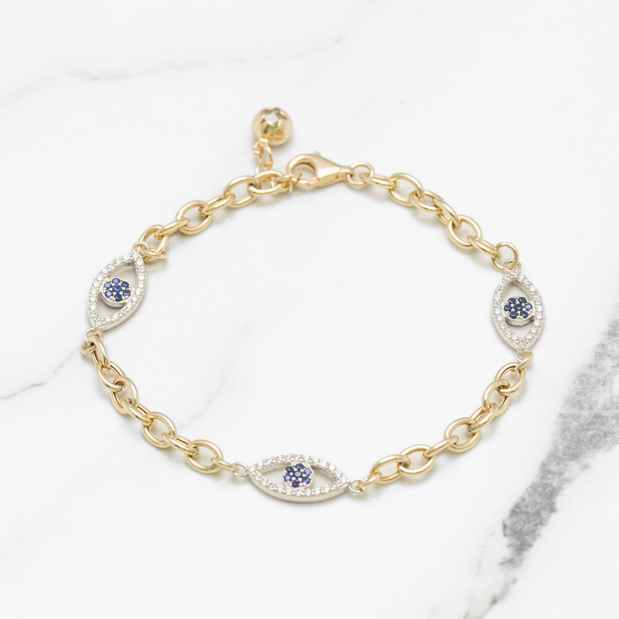 Bracelet femme en or 10K deux tons jaune et blanc, orné de trois mauvais œil pavé cz et de maillons câble, mesurant 7.5 pouces. Un bijou chic et symbolique, parfait pour un style raffiné et protecteur.