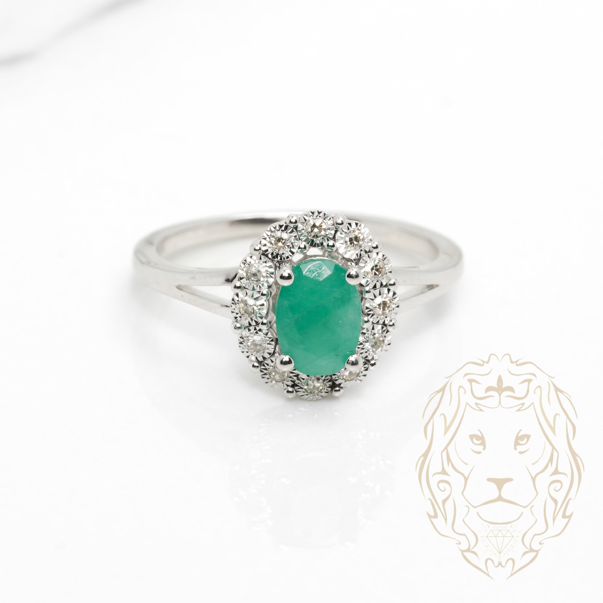 Cette bague en or 10K blanc met en valeur une émeraude ovale entourée d’un halo de diamants naturels totalisant 0.20TCW.
