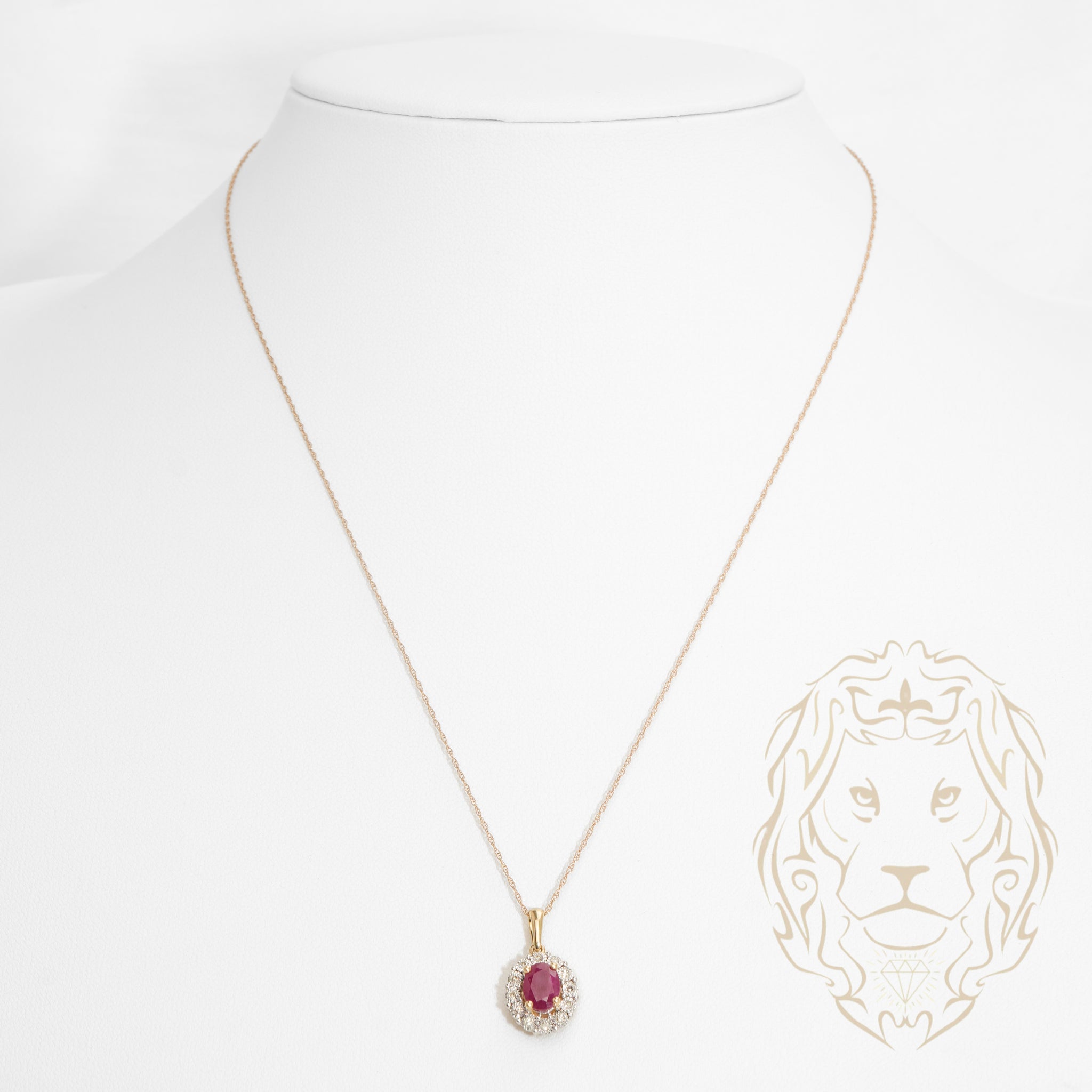 Ce collier en or 10K jaune présente un rubis ovale entouré d’un halo de diamants naturels totalisant 0.20TCW.