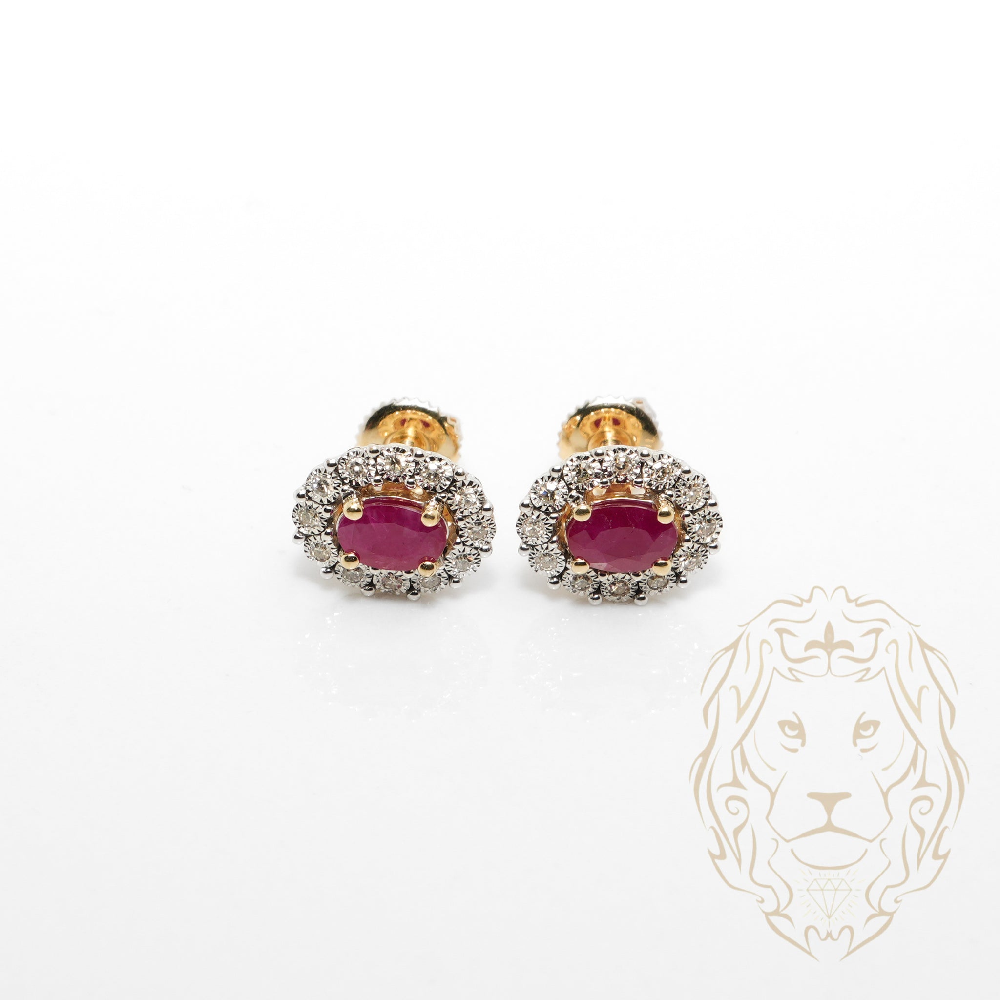 Ces studs à visser en or 10K deux tons présentent des rubis ovales entourés d’un halo de diamants naturels totalisant 0.15TCW.