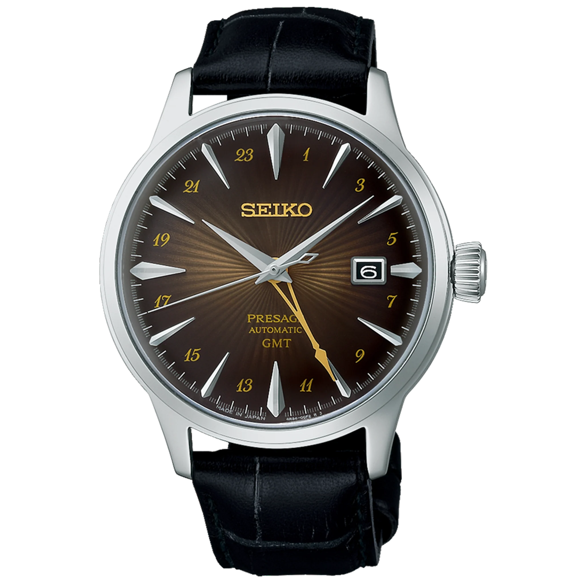 La Seiko Presage SSK039J1 est une montre automatique GMT inspirée du célèbre cocktail “Rusty Nail”, un mélange raffiné de scotch, Drambuie et zeste de citron servi au légendaire Star Bar de Ginza, à Tokyo.