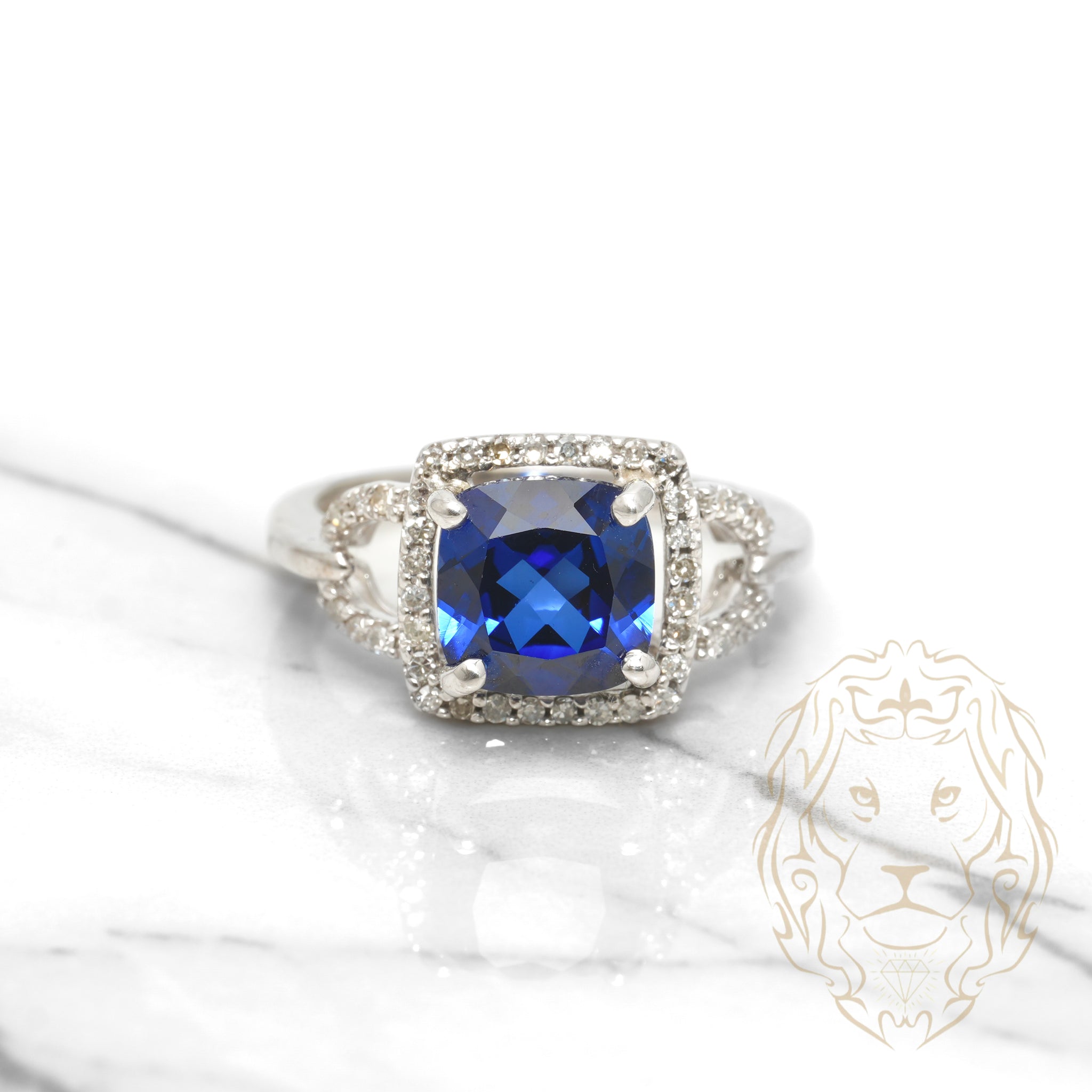 Cette bague de fiançailles en or blanc 10K, ornée d’un halo de cristal bleu taille coussin de 2.00 carats et pavée de 0.35 carats de diamants naturels, est une déclaration d’élégance et de romantisme intemporel.