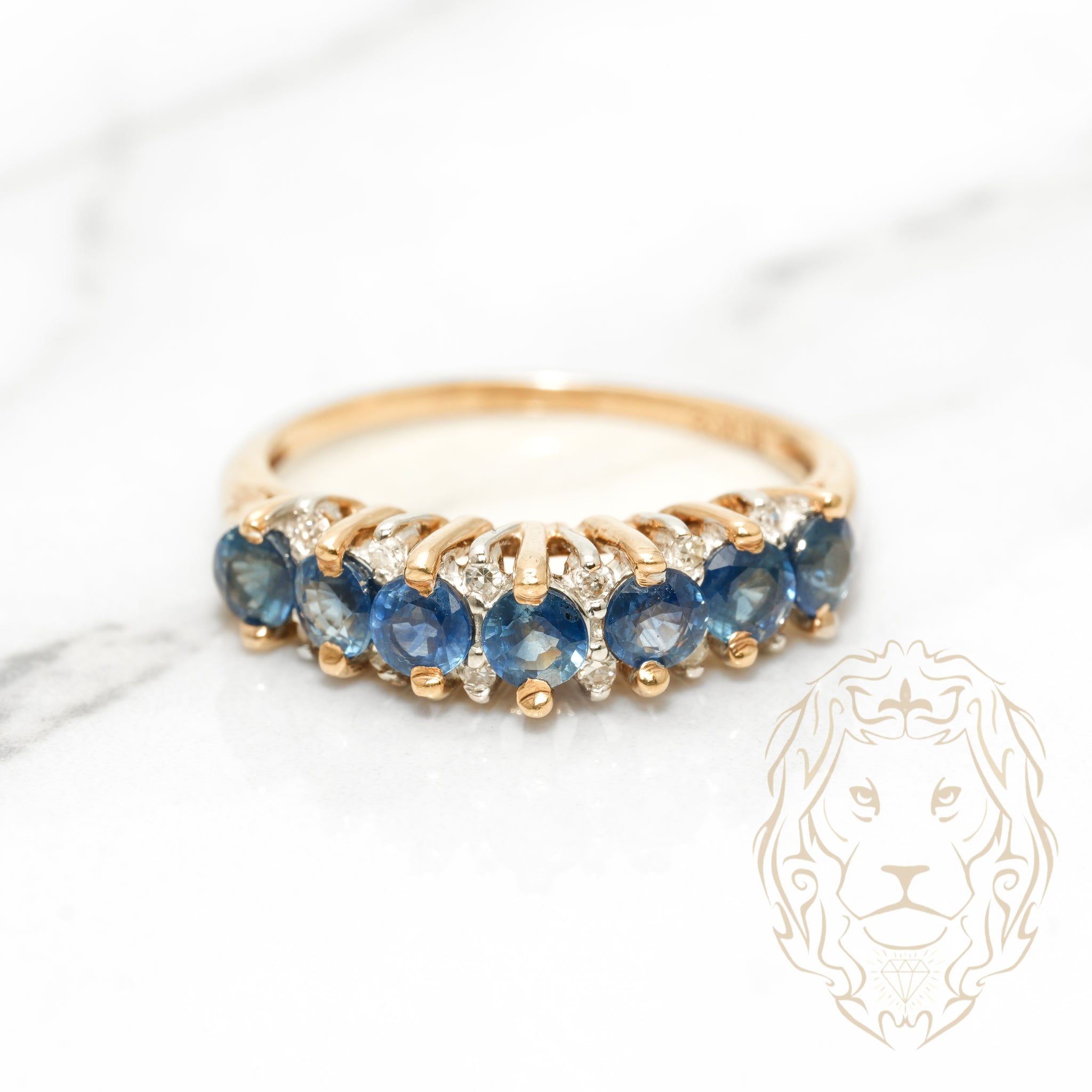 Cette bague en or jaune 10K, mettant en avant une pyramide de saphirs de 1.20CT et 0.20CT de diamants naturels, est parfaite pour un style luxueux et unique.