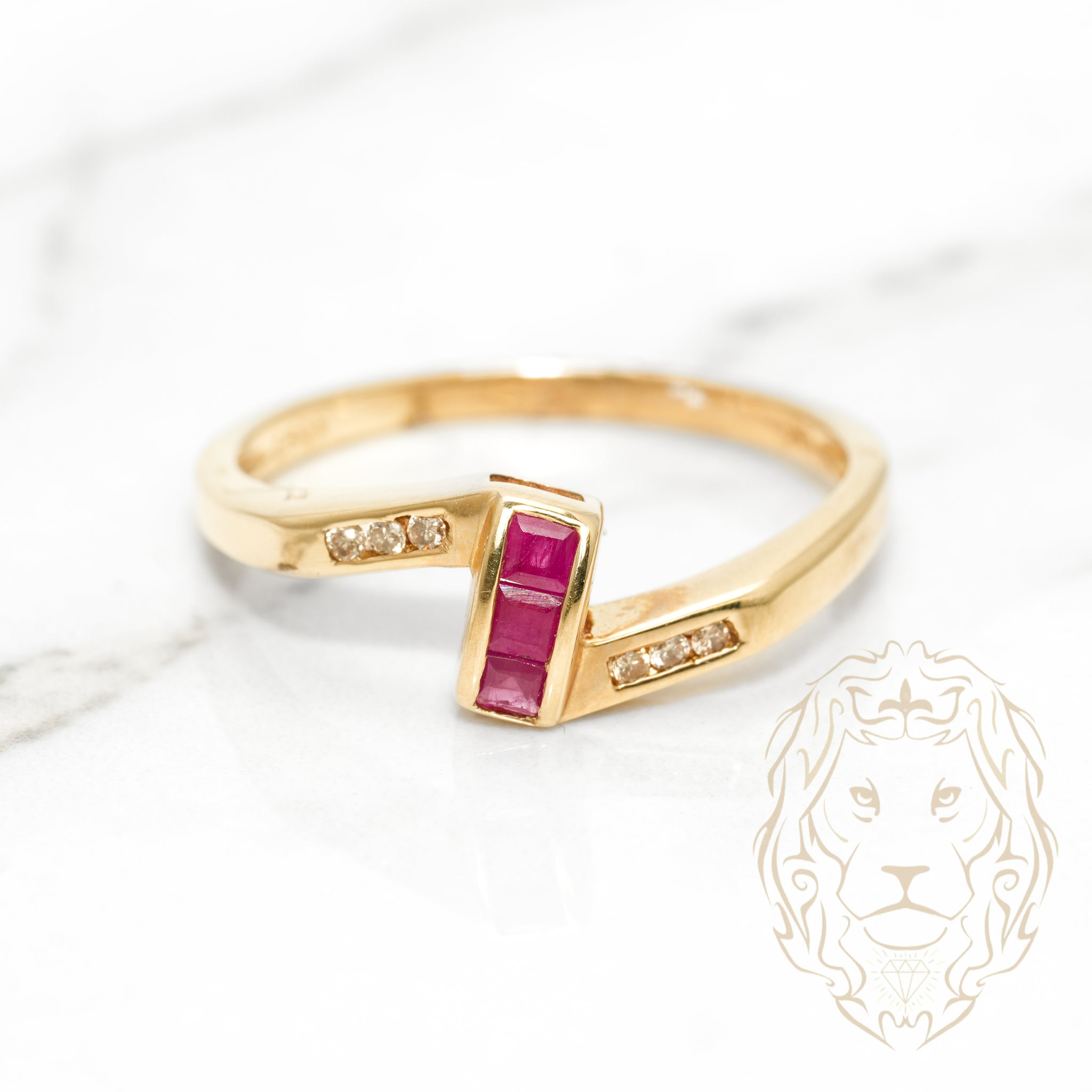 Cette bague en or jaune 10K, avec un rubis coupe princesse de 0.12CT et 0.08CT de diamants naturels sertis en canal, est un bijou intemporel au charme discret.