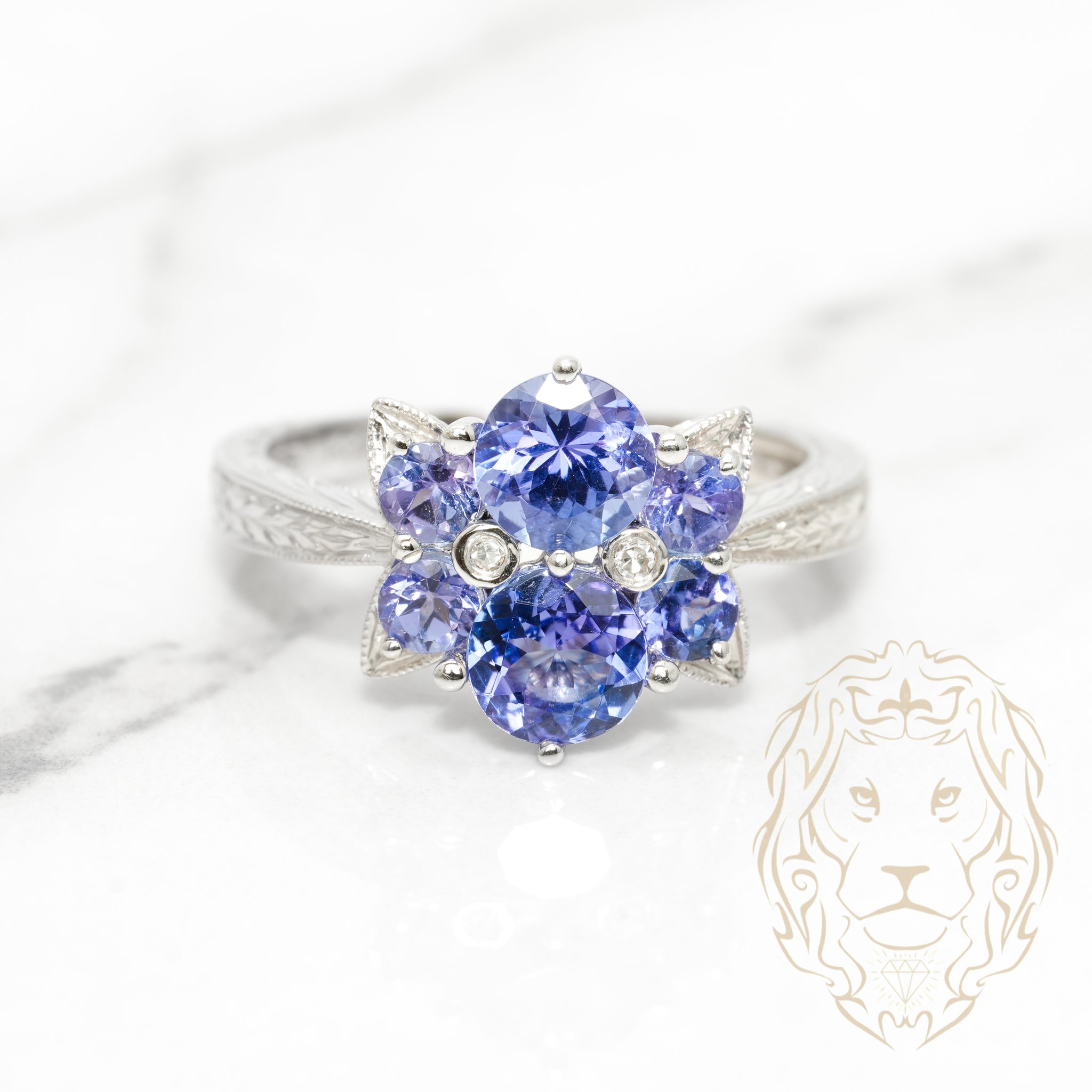 Cette bague en or blanc 14K, décorée de fleurs en améthystes totalisant 1.30CT et 0.08CT de diamants naturels, est un bijou féminin et raffiné.