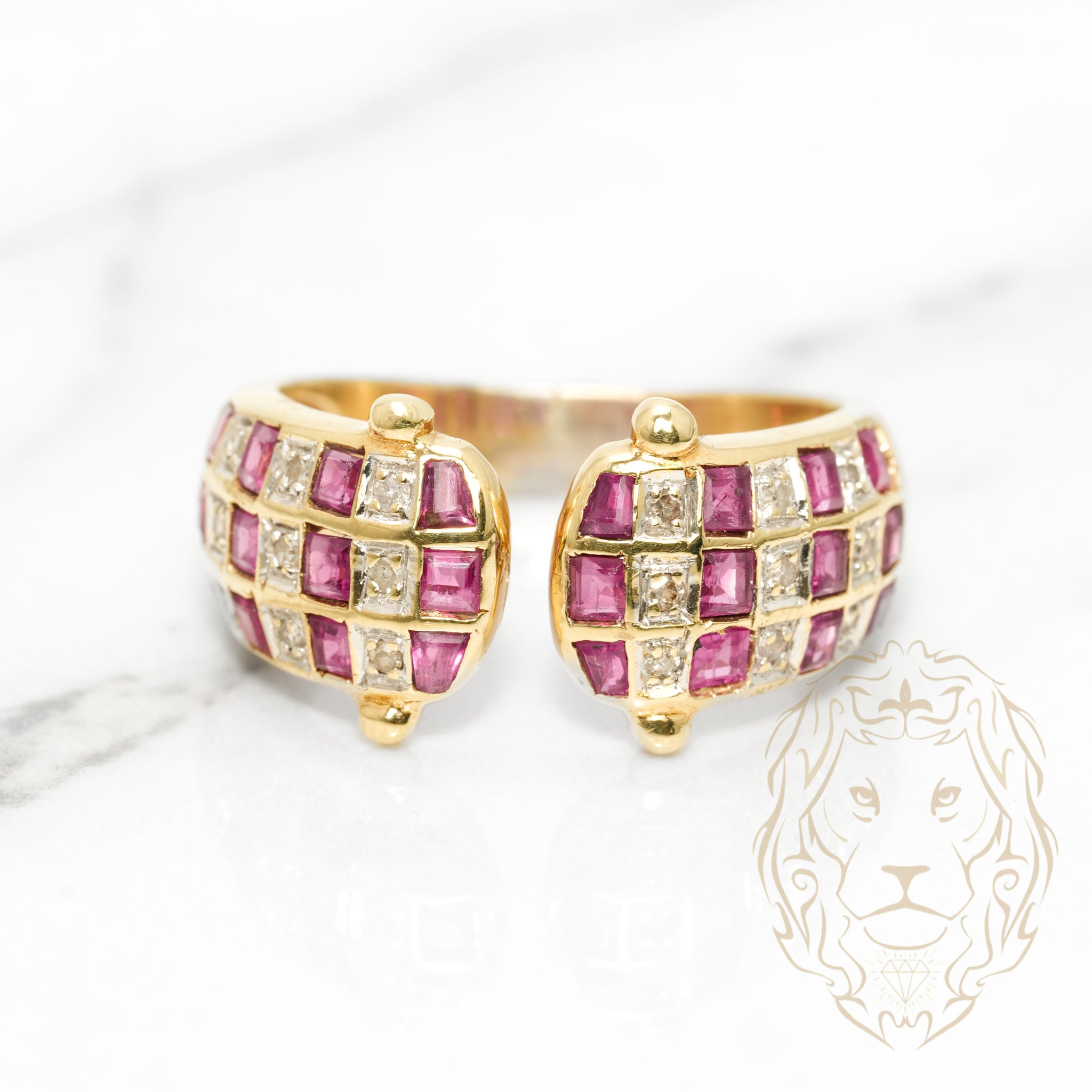 Cette bague ouverte en or jaune 14K, ornée de rubis totalisant 0.30CT et de 0.12CT de diamants naturels, incarne un style innovant et luxueux.