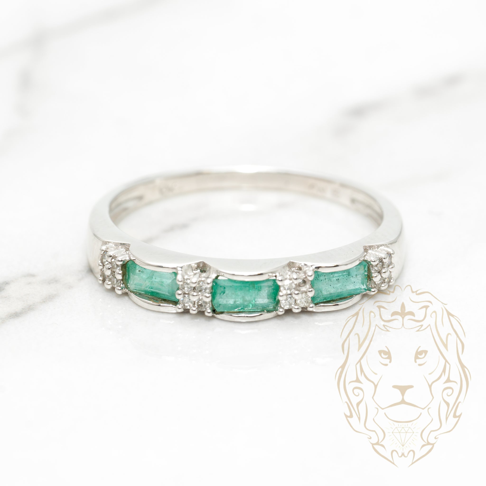 This 10K white gold ring, featuring 0.15CT emeralds and 0.10CT natural diamonds, embodies discreet, sophisticated elegance.