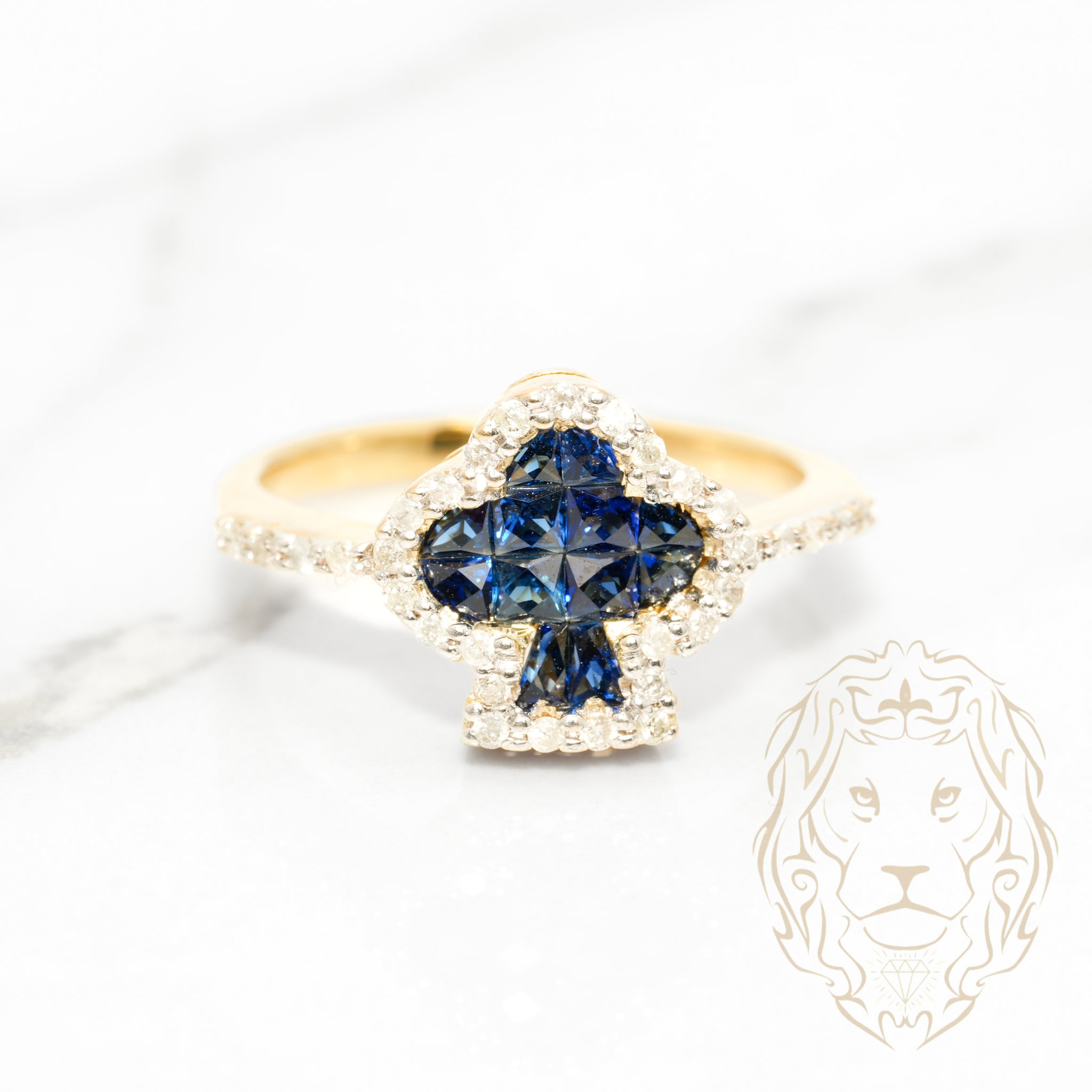 This 14K yellow gold ring, in the shape of a clover set with 0.80CT sapphires and 0.60CT natural diamonds, combines symbolism and elegance.