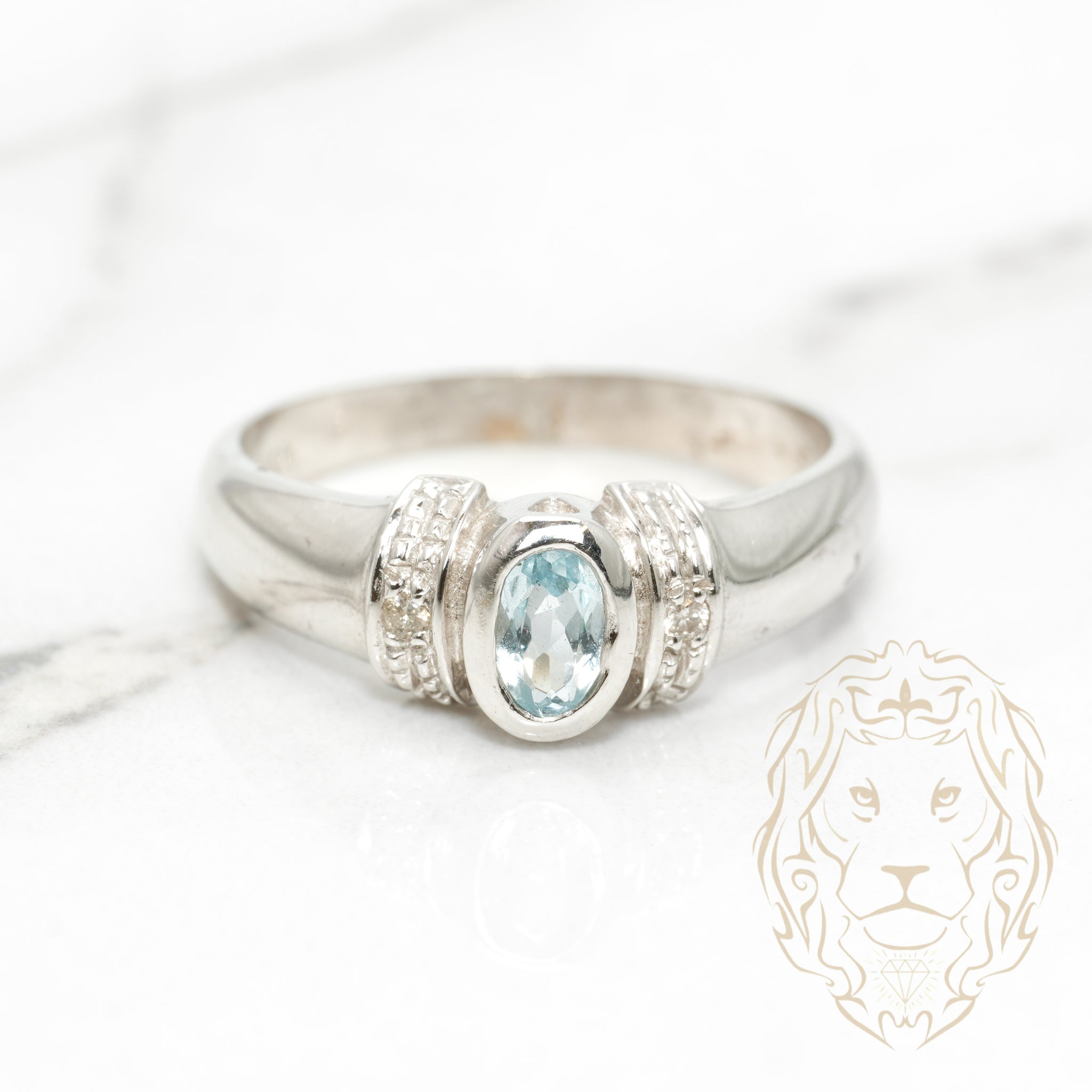 This ring in 14K white gold, with a 0.25CT oval-cut aquamarine set close and 0.08CT natural diamonds, is ideal for a delicate, timeless style.