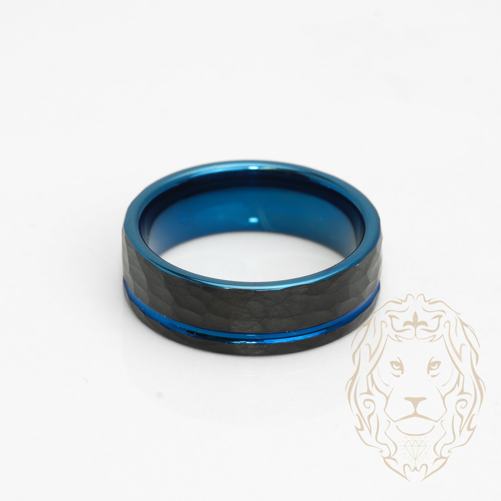 This black and blue tungsten ring features a hammered surface with a polished groove for a rugged yet refined effect.