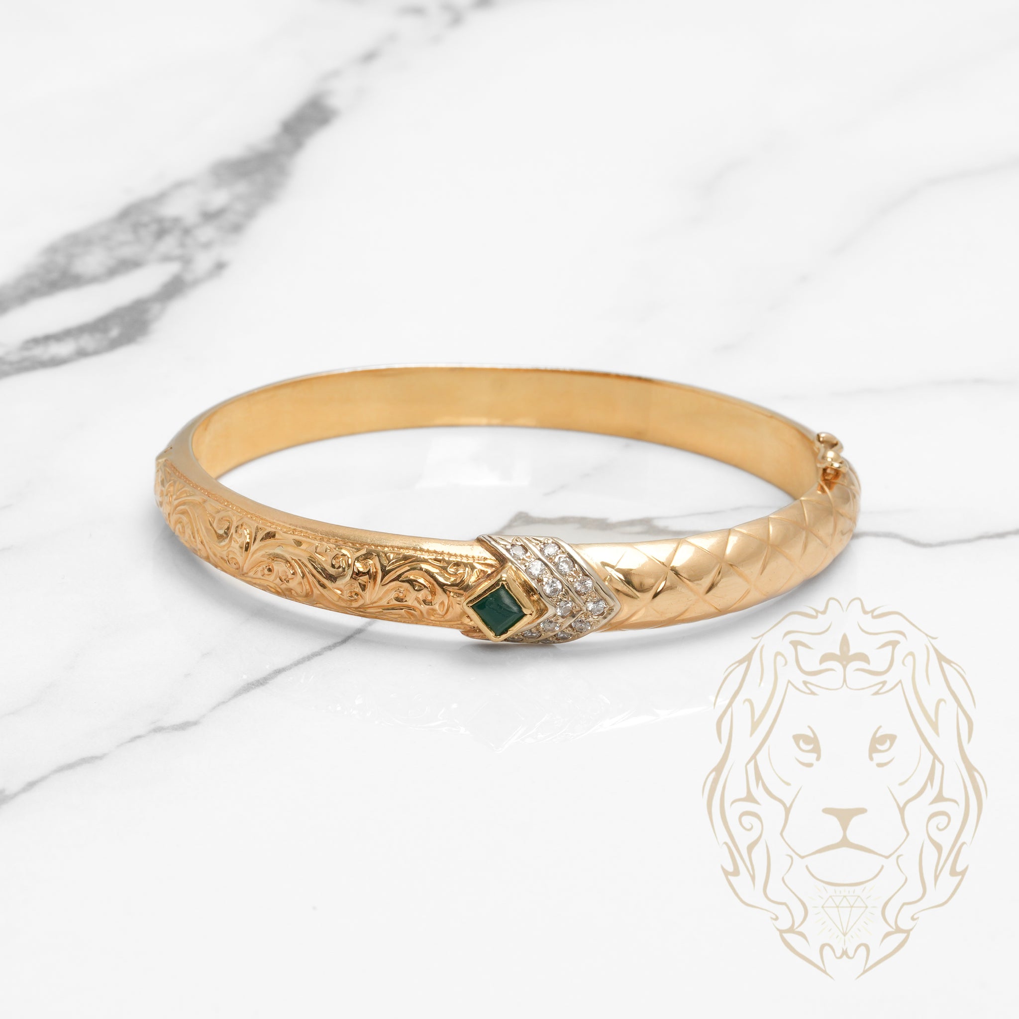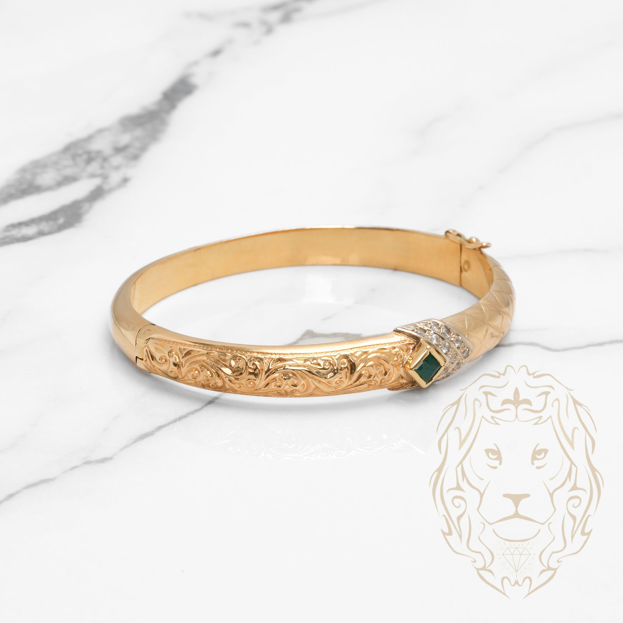 Ce bracelet jonc au motif traditionnel est orné d’une pierre cz verte et pavé, pour un bijou à la fois classique et éclatant.