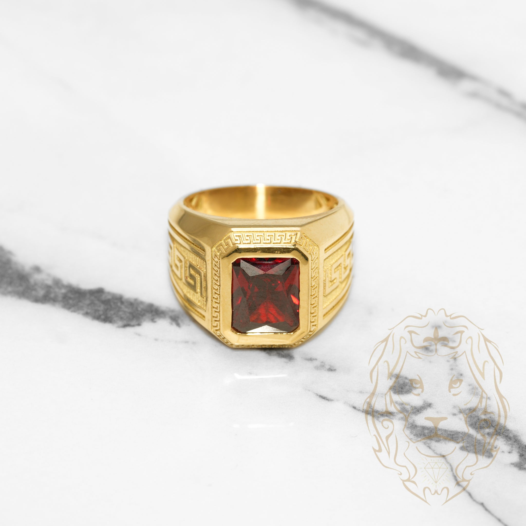 In 18K yellow gold, this signet ring, adorned with a red cz stone and a Greek key motif, exudes timeless elegance.