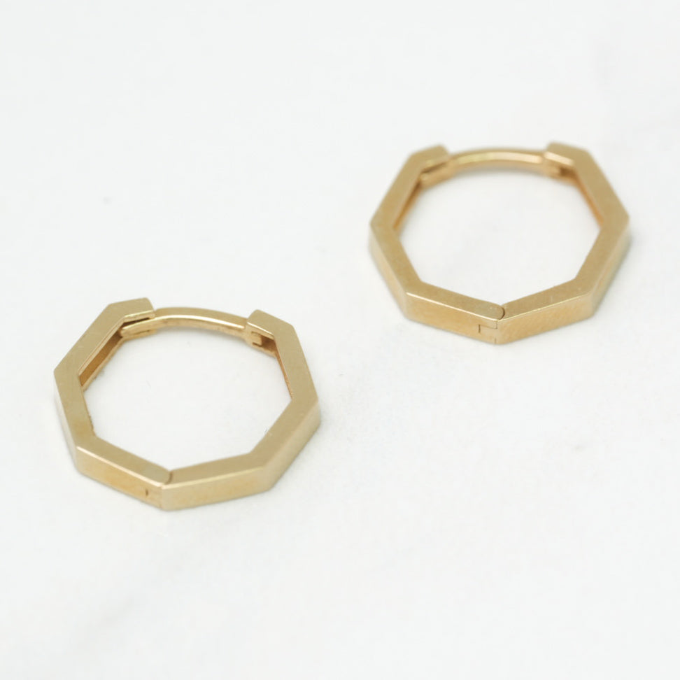 These octagonal huggies in 10-carat yellow gold feature a unique geometric shape and polished finish. They add a touch of modernity and sophistication, perfect for lovers of contemporary jewelry.